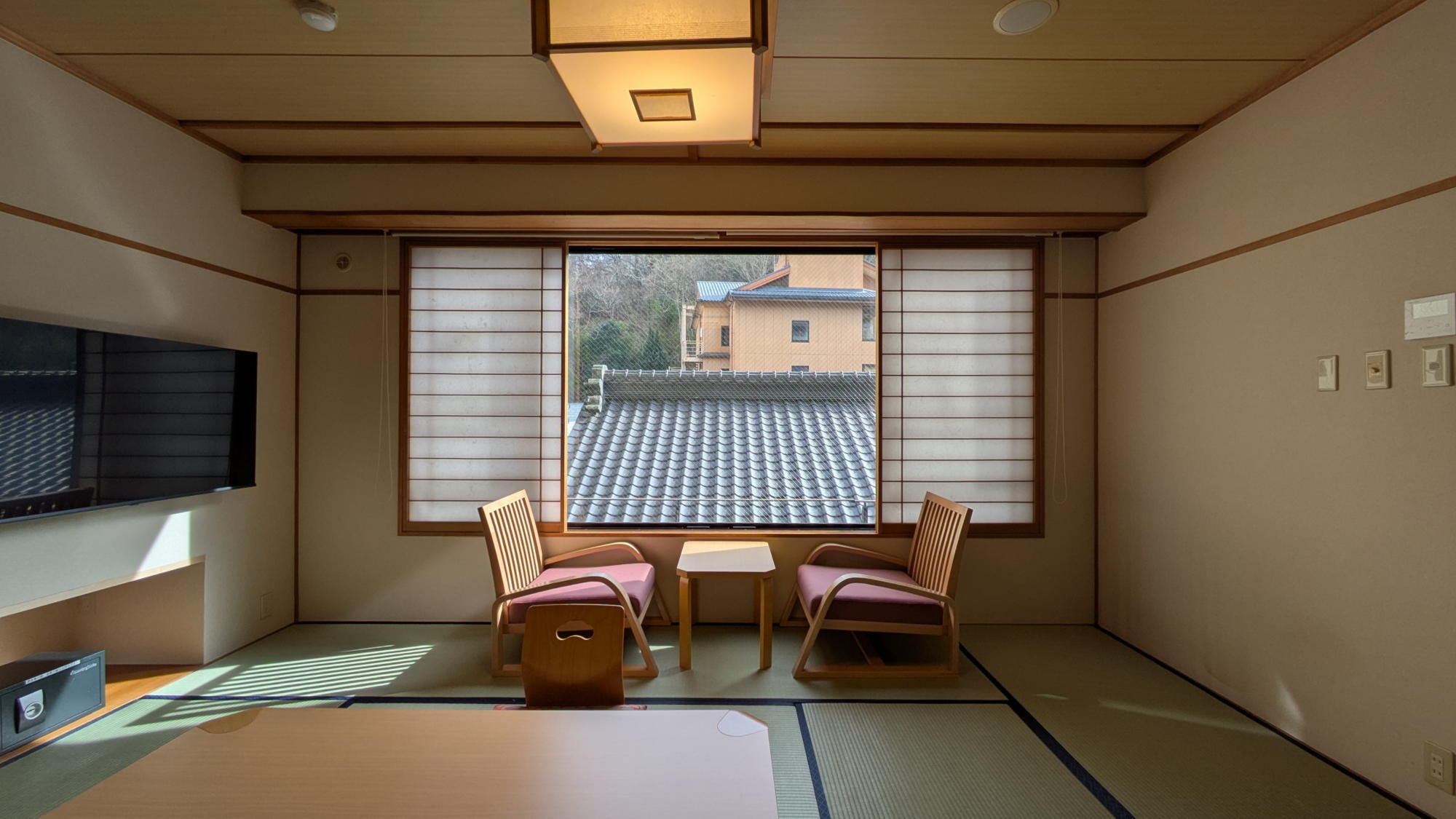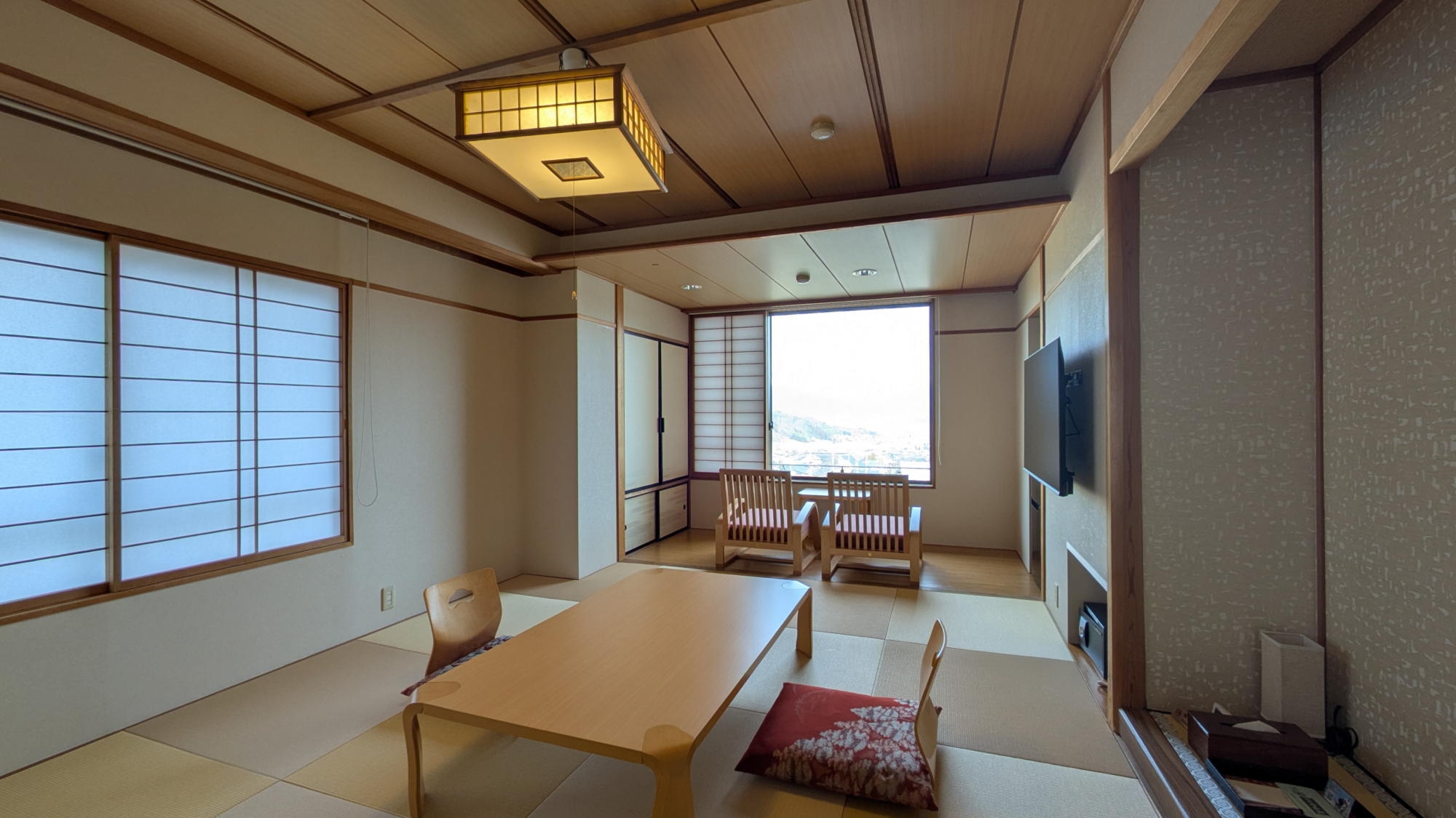 上層階に位置する展望保証の和室は、窓の向こうに広がる町並みを一望できる贅沢なロケーションをお楽しみいただけます。湯上がりに景色を眺め、ほっとひと息する時間を。