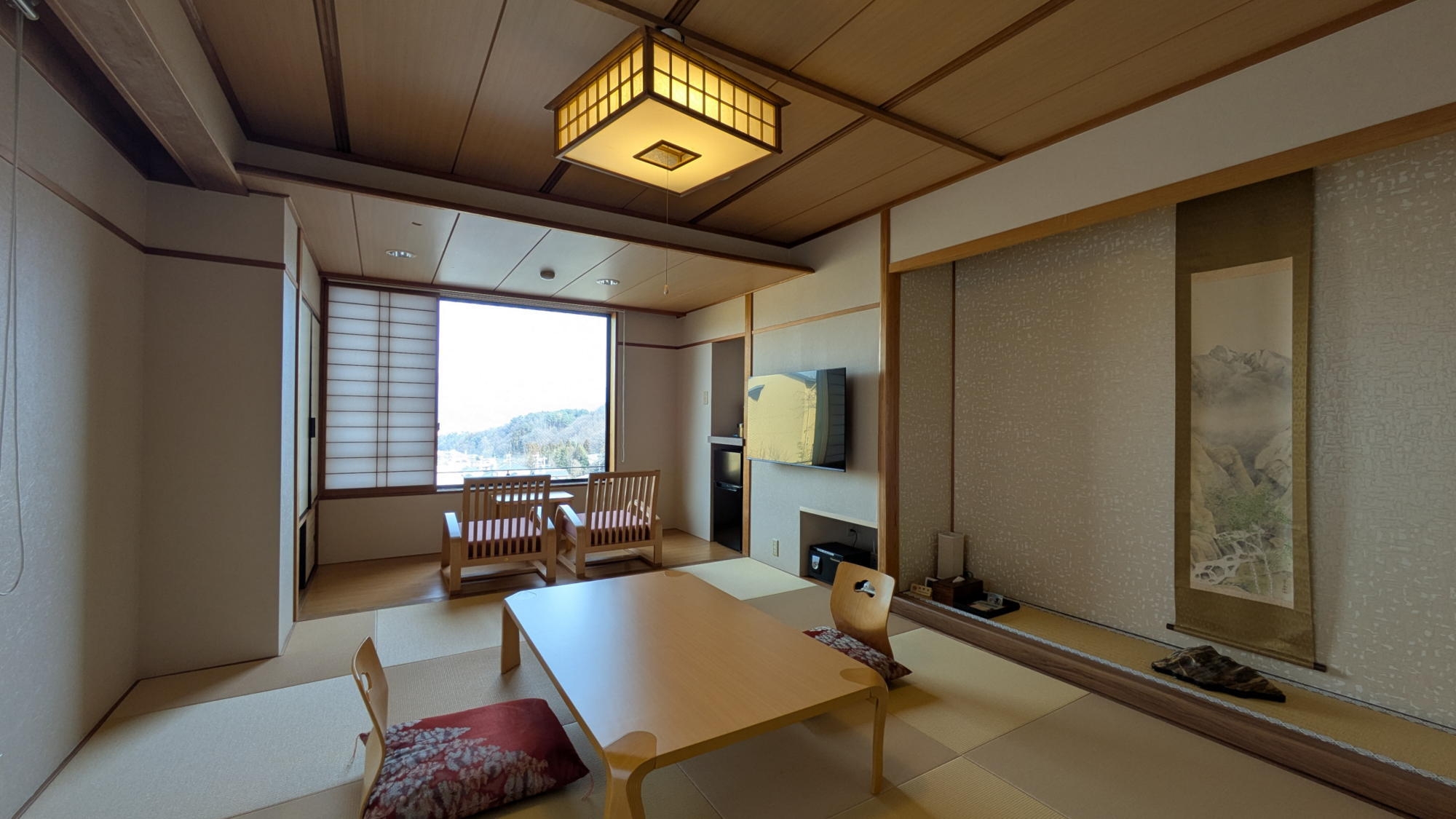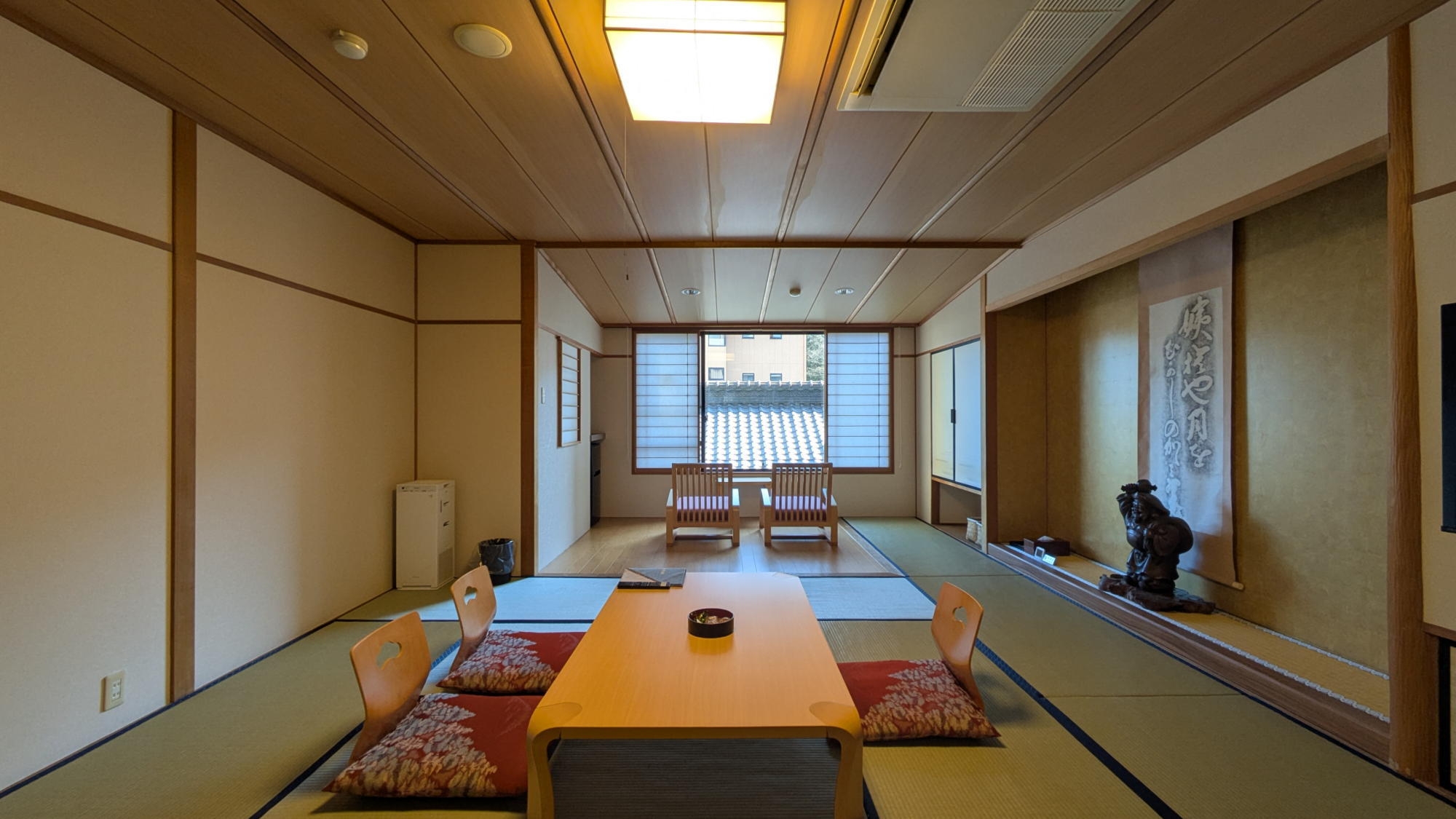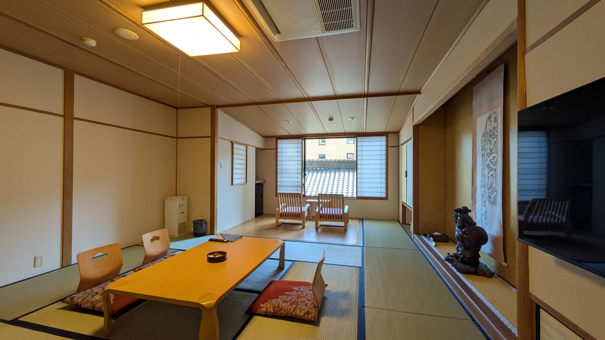 12畳の広々とした和室に加え、6畳の掘りごたつ付きの間を備えた、趣あるお部屋です。明治時代の梁が、時を越えた風情を醸し出します。