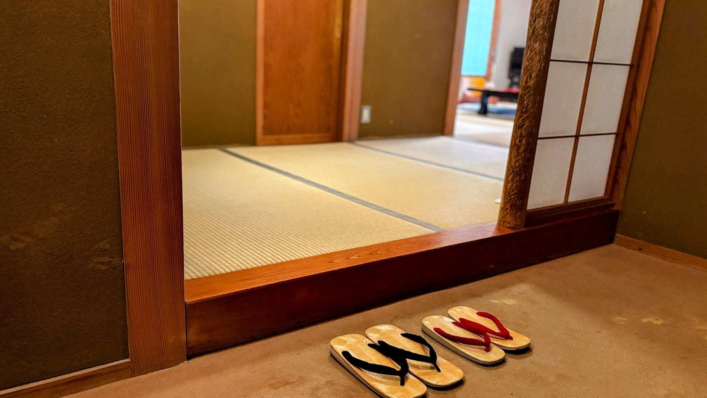 和室2間のゆったりとした客室はカップルやファミリーまでごゆっくりお寛ぎいただける空間です。 専用露天風呂はヒノキ風呂と岩風呂のどちらかの客室になります。