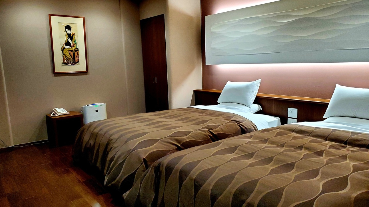 (お子様利用可)和室2間にツインベット ひのきの内風呂は ゆったりと足が伸ばせる広いお風呂。 ダイニングルームがありイステーブル席でのお食事が可能