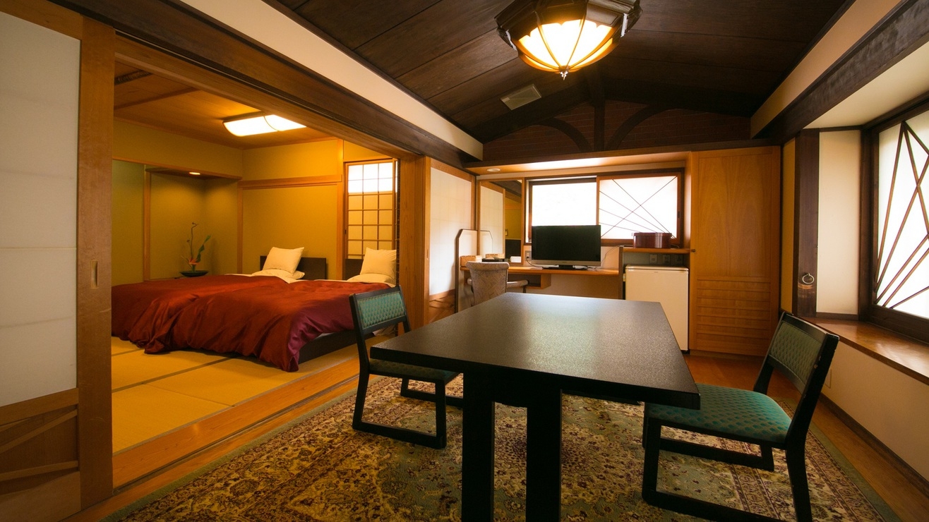 和室10畳+洋室(ツインベット)露天風呂+内湯+箱庭付。 隣接した客室が無いので、カップルからファミリーまでよりプライベートな滞在におすすめ。