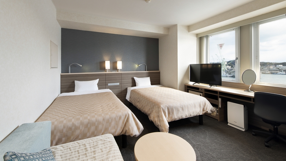 <海外通りに面したお部屋◆窓から尾道水道を一望>カップルや友人グループの旅行にオススメのツインのお部屋です。ワイドセミダブルベッド2台設置