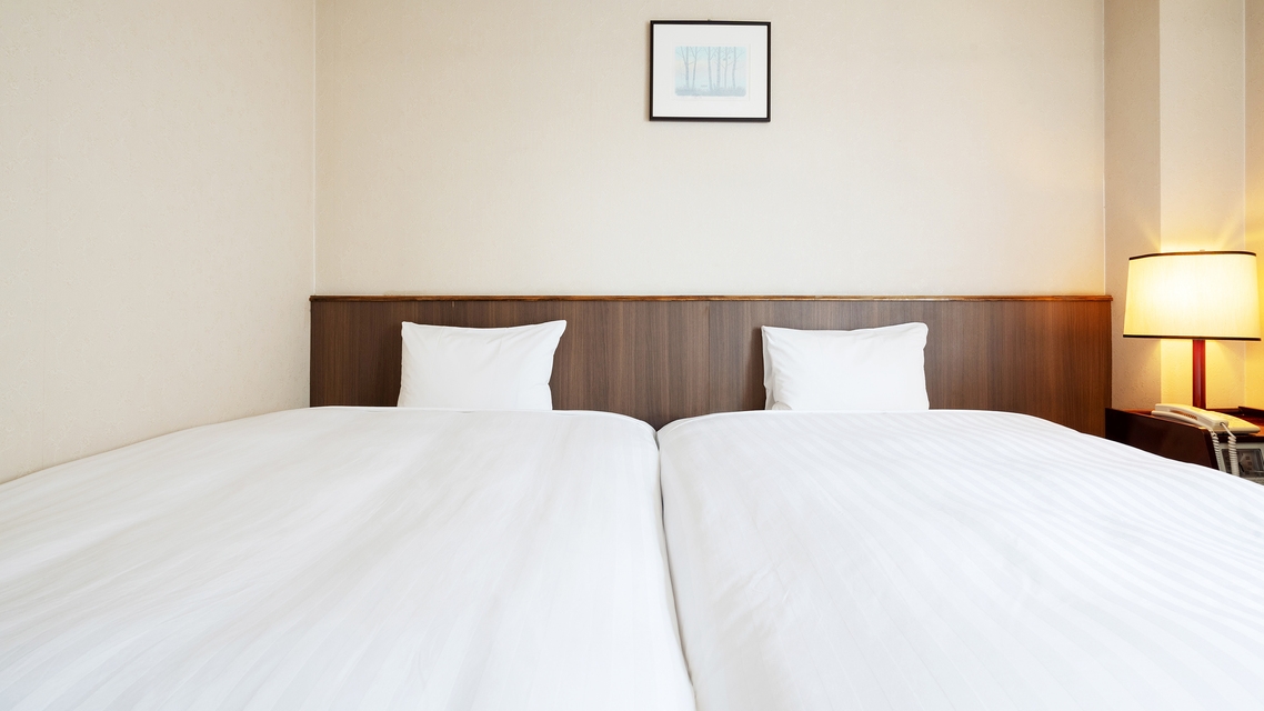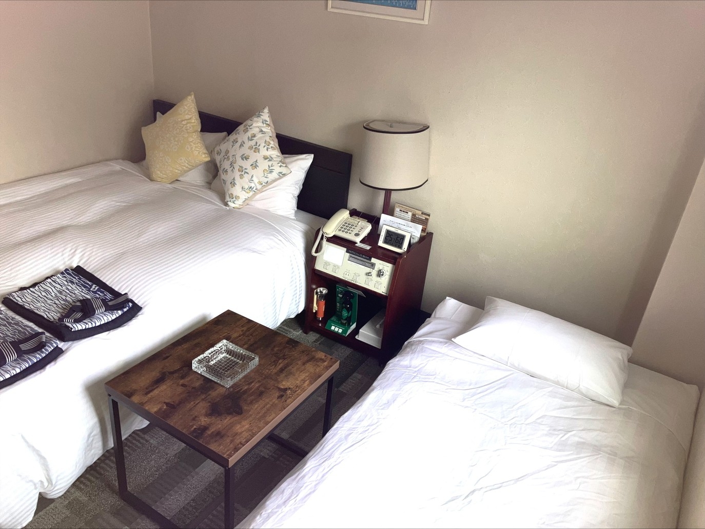 ベッド幅90cm×2台・歯ブラシ・剃刀・ブラシ・靴磨き・冷蔵庫(空)・金庫・電話・ポット・緑茶・水割りセット・ズボンプレッサー・LANケーブル