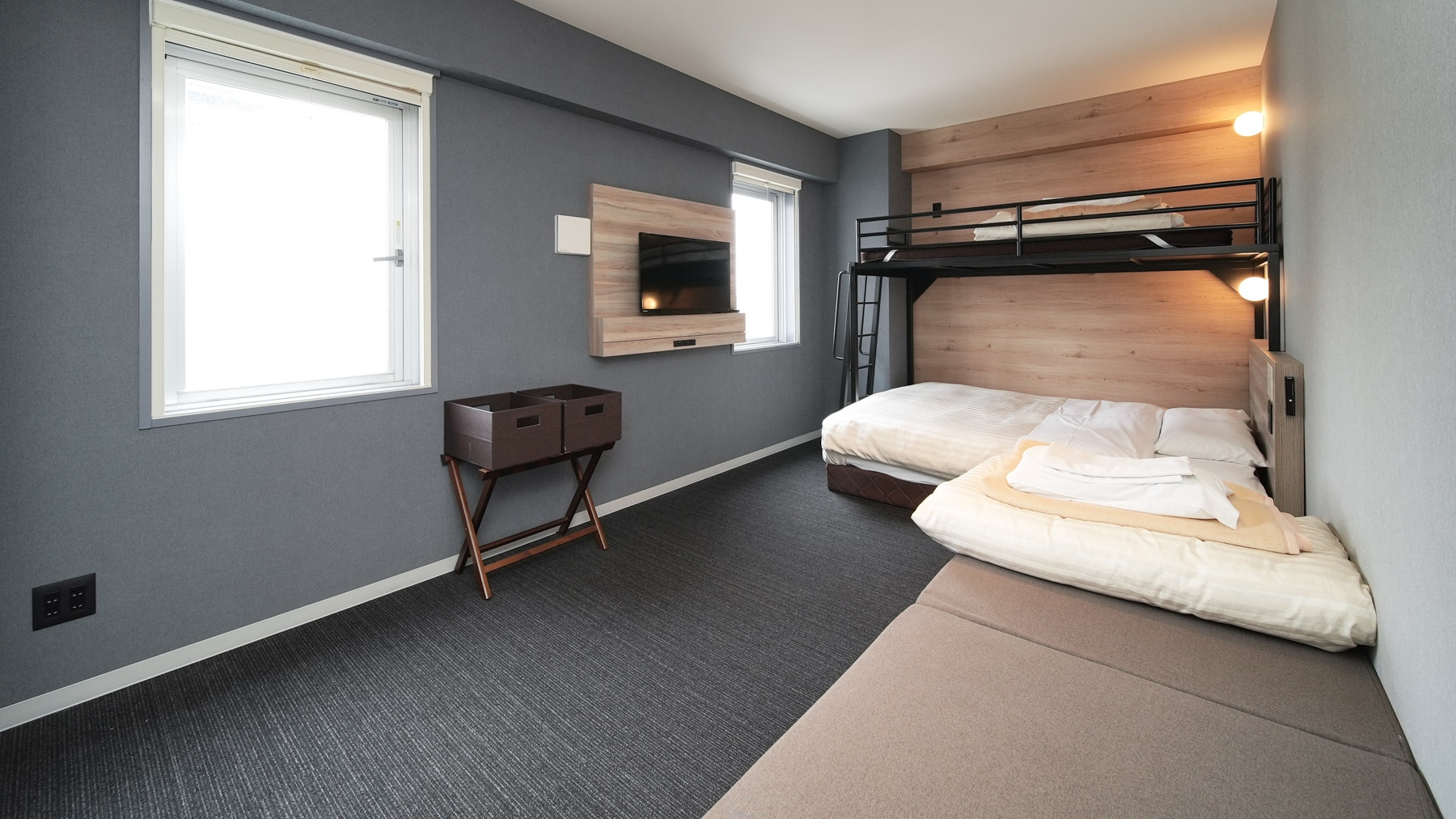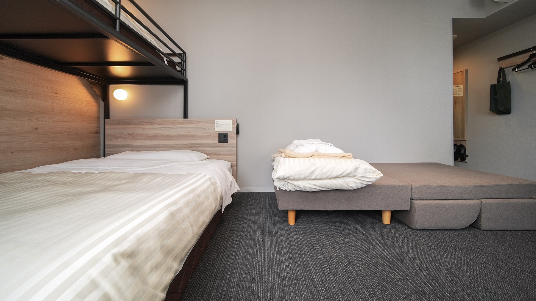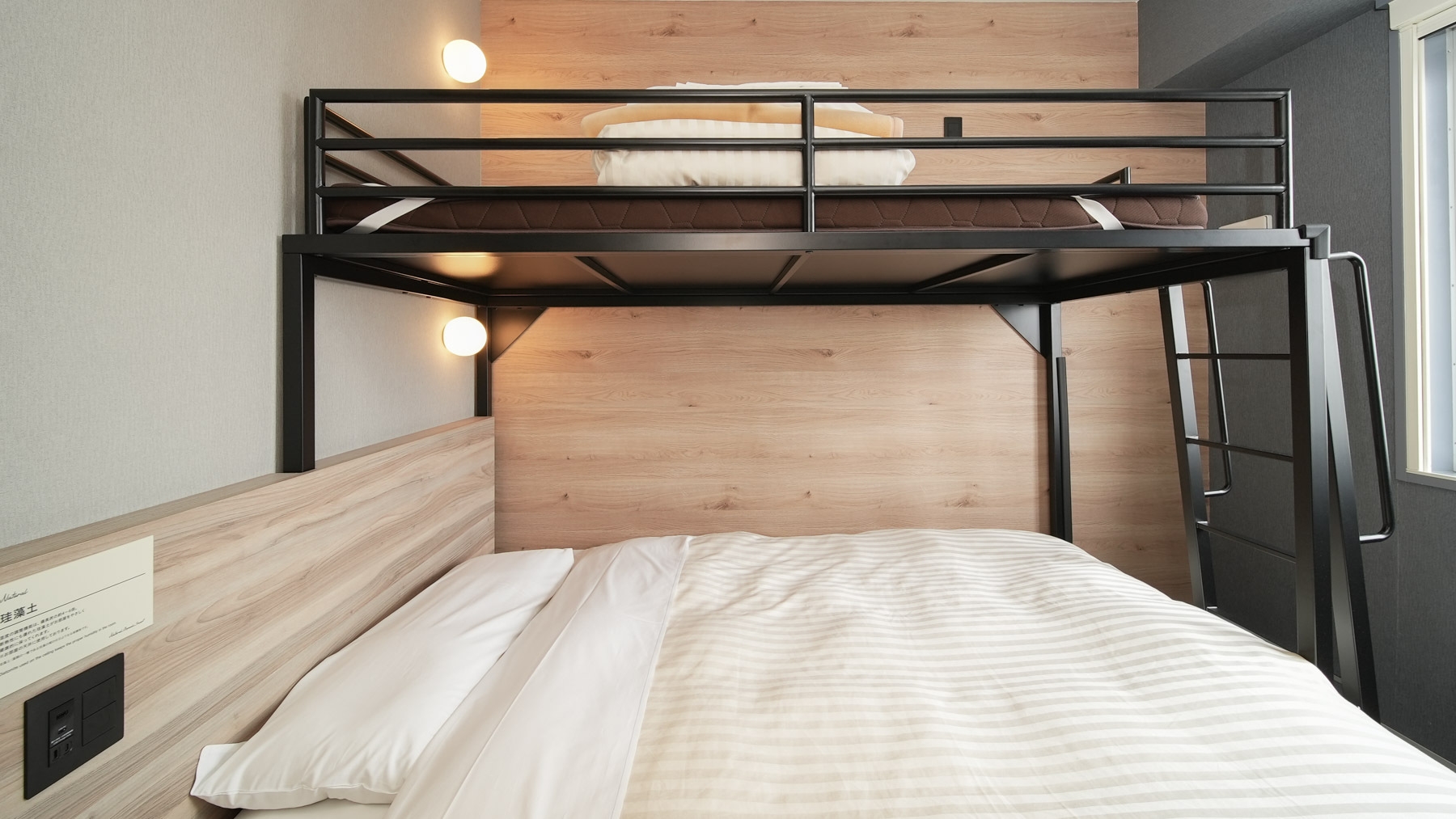 定員3名までお泊り頂ける【トリプルルーム】です。 ダブルサイズベッドとロフトベッドに、90cm幅のソファベッドが1台あるお部屋で、ご家族などにお勧めです。