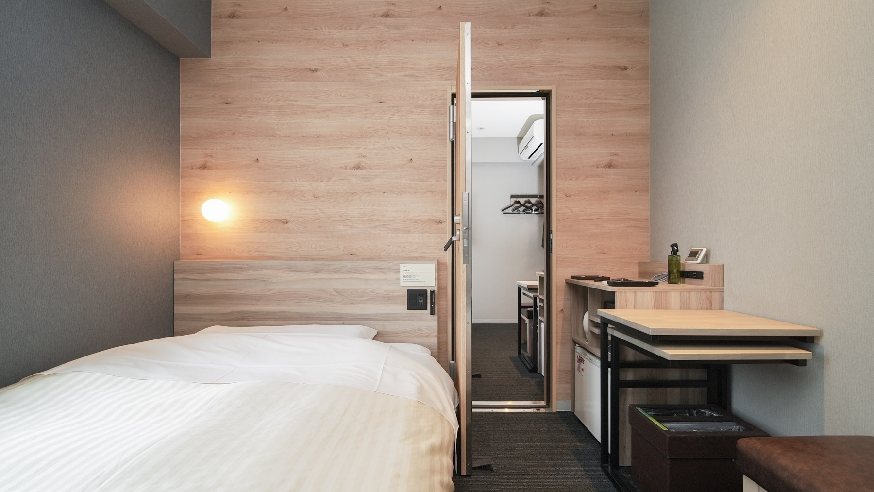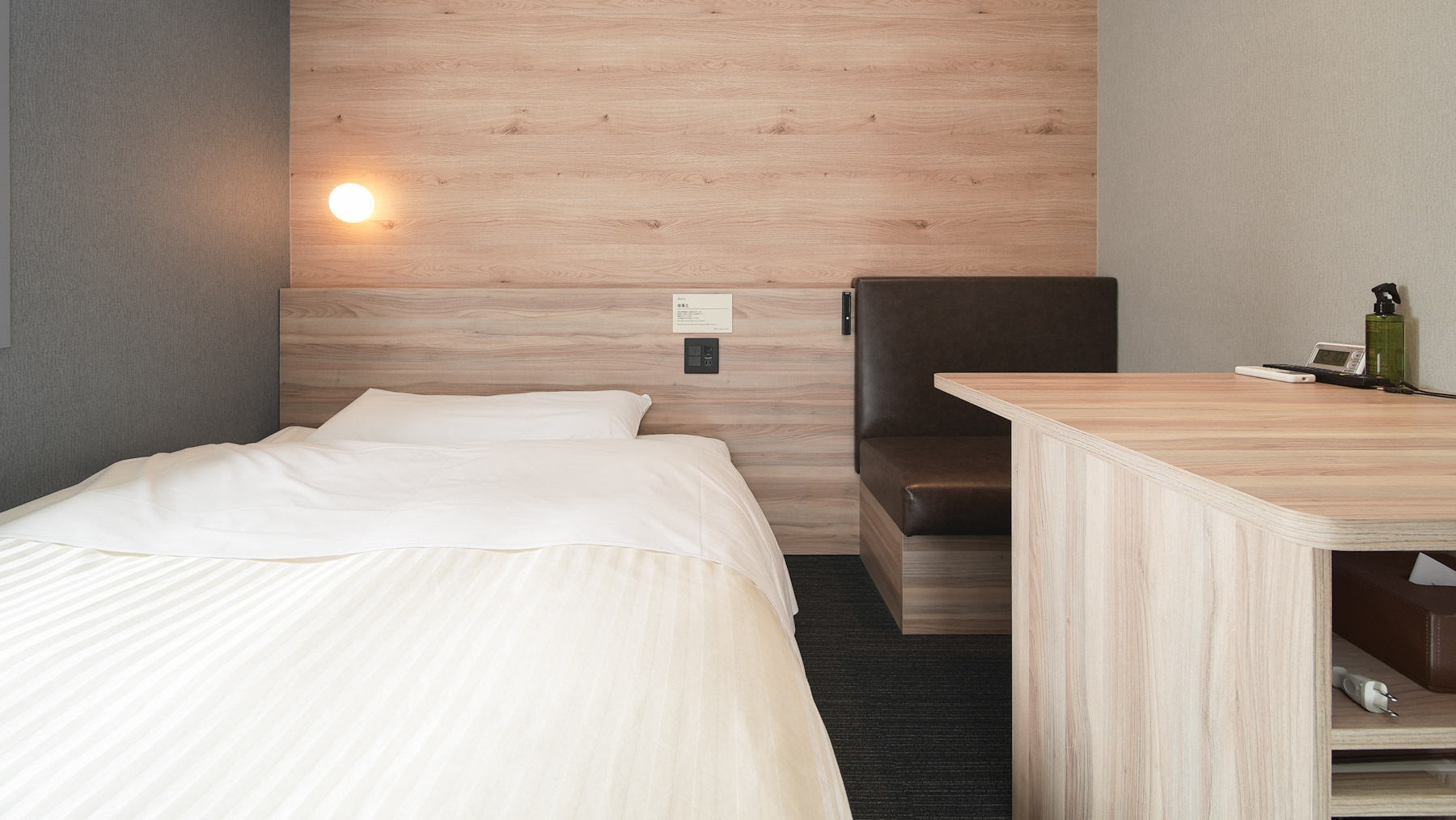 150cm幅のワイドベッド+広々デスクの【エクストラルーム】です。 広々デスクで仕事や作業がしやすいお部屋です。