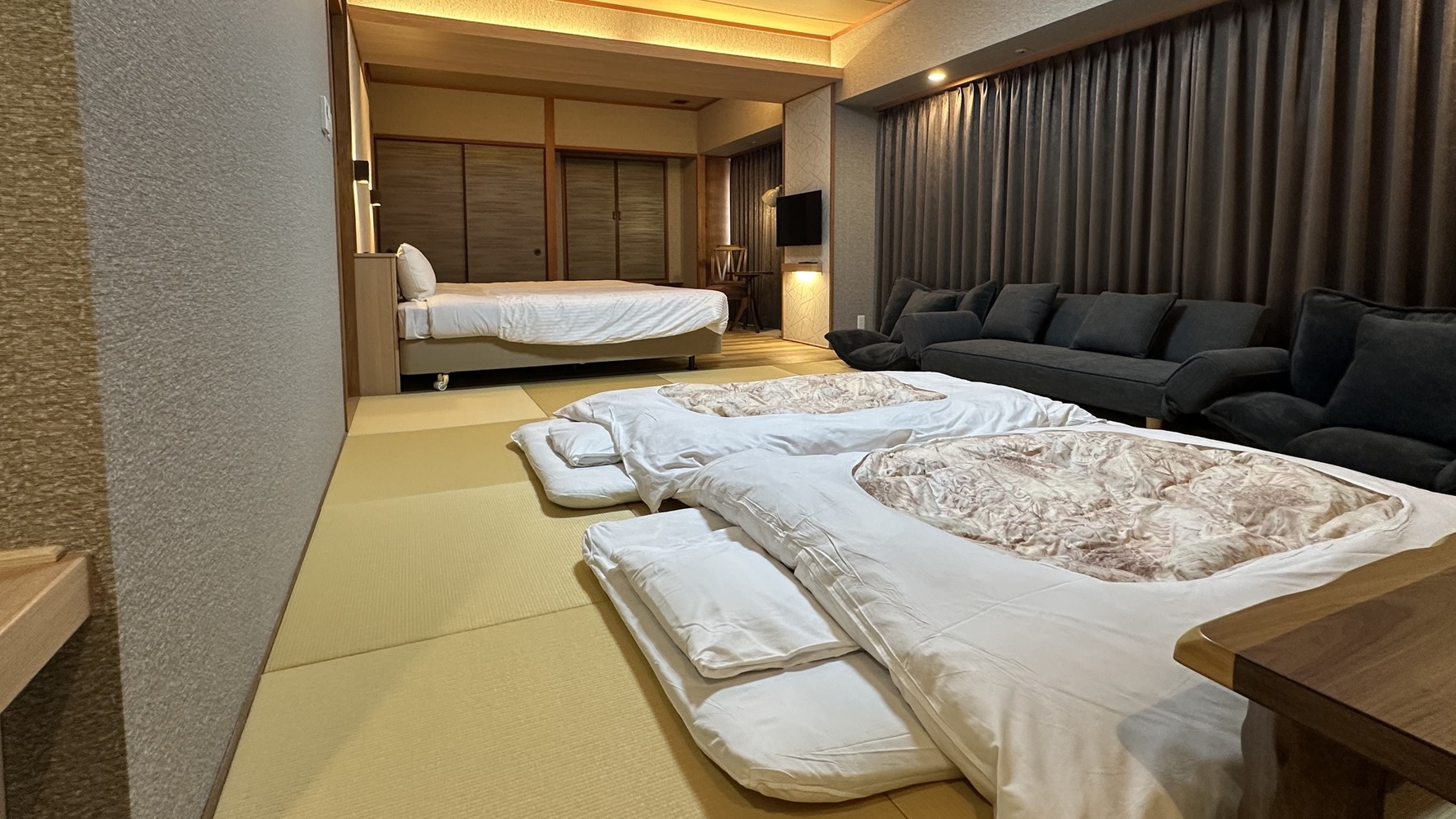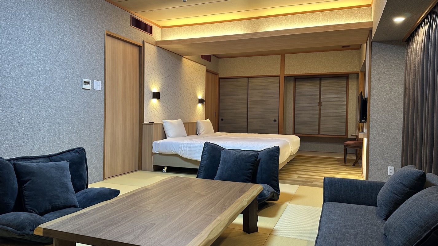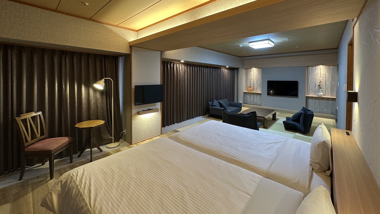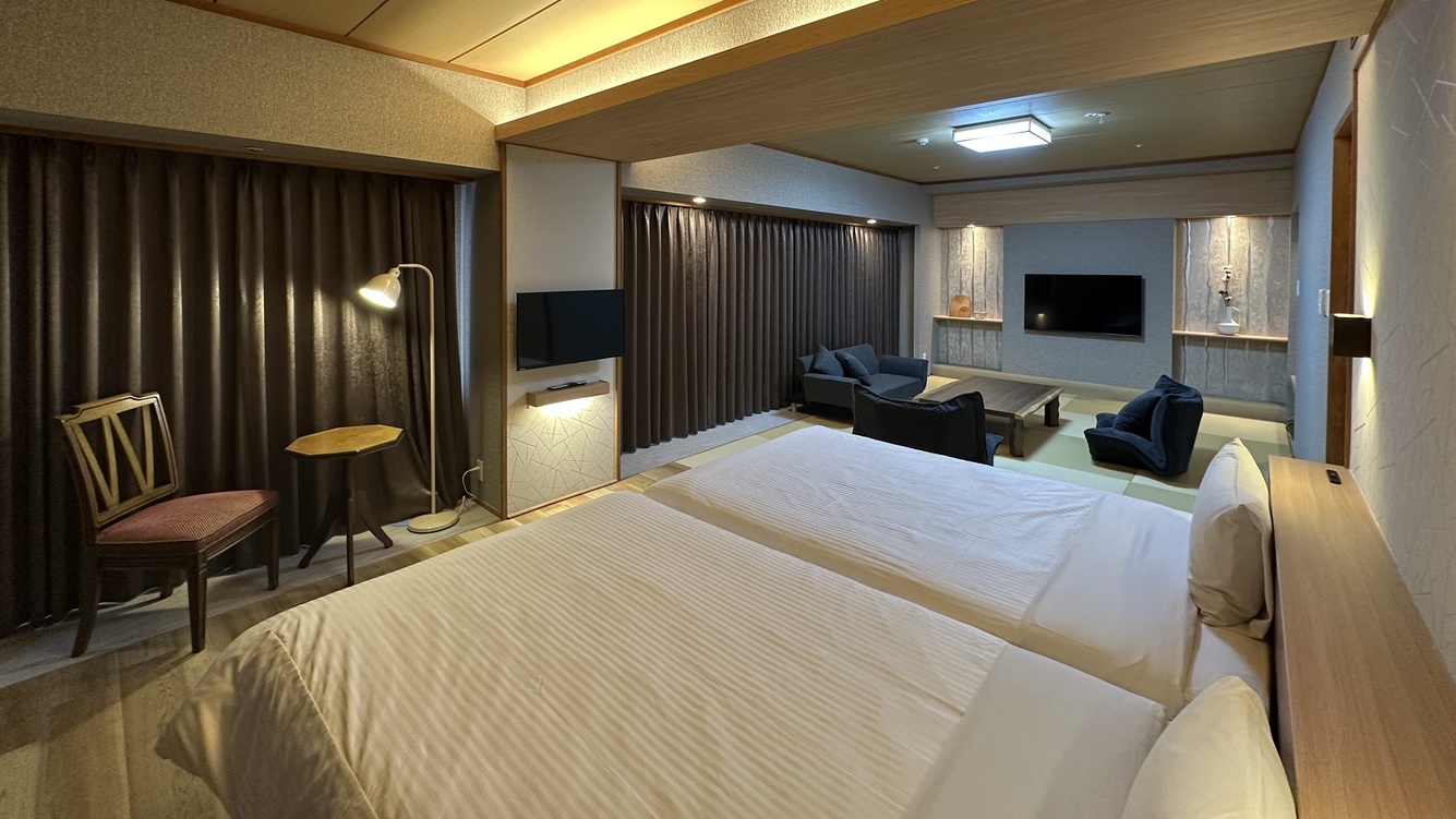 2026年2月リニューアル!18畳のゆったり和洋室。2名様(2台ベッド)はもちろんグループ・ご家族でのご利用可能※無料Wi-Fi完備※YouTubeTV対応