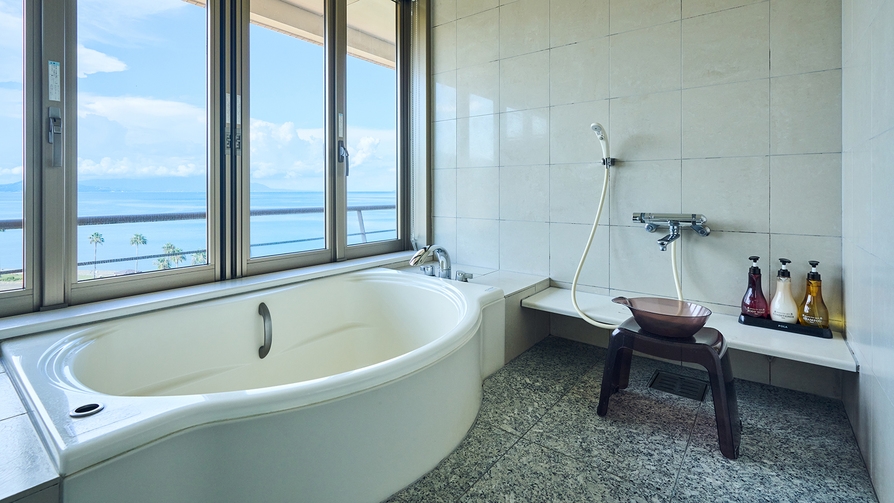 14,5畳(本間10畳、次の間4.5畳)の海側和室。室内風呂は半露天(沸かし湯)となっており天草の海原を一望いただけます。