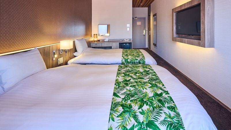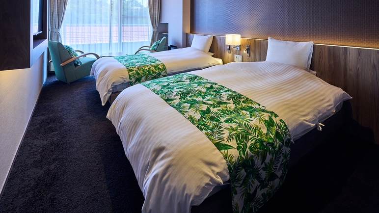 スタイリッシュツインは、新たに改装した少し広めのモダンなツイン。上質な寛ぎのためにシモンズのベッドと、こだわりのチェアをご用意しております。
