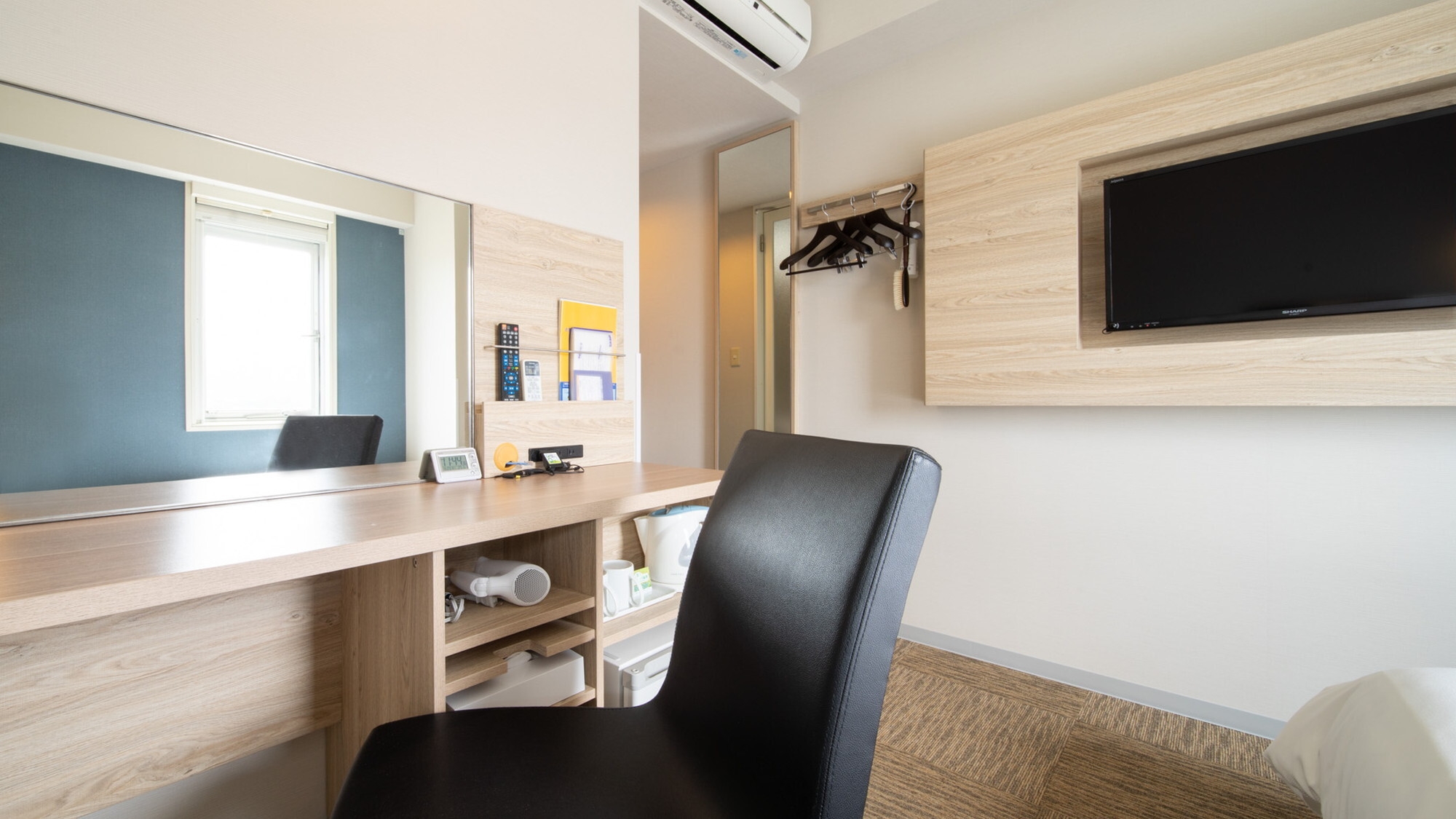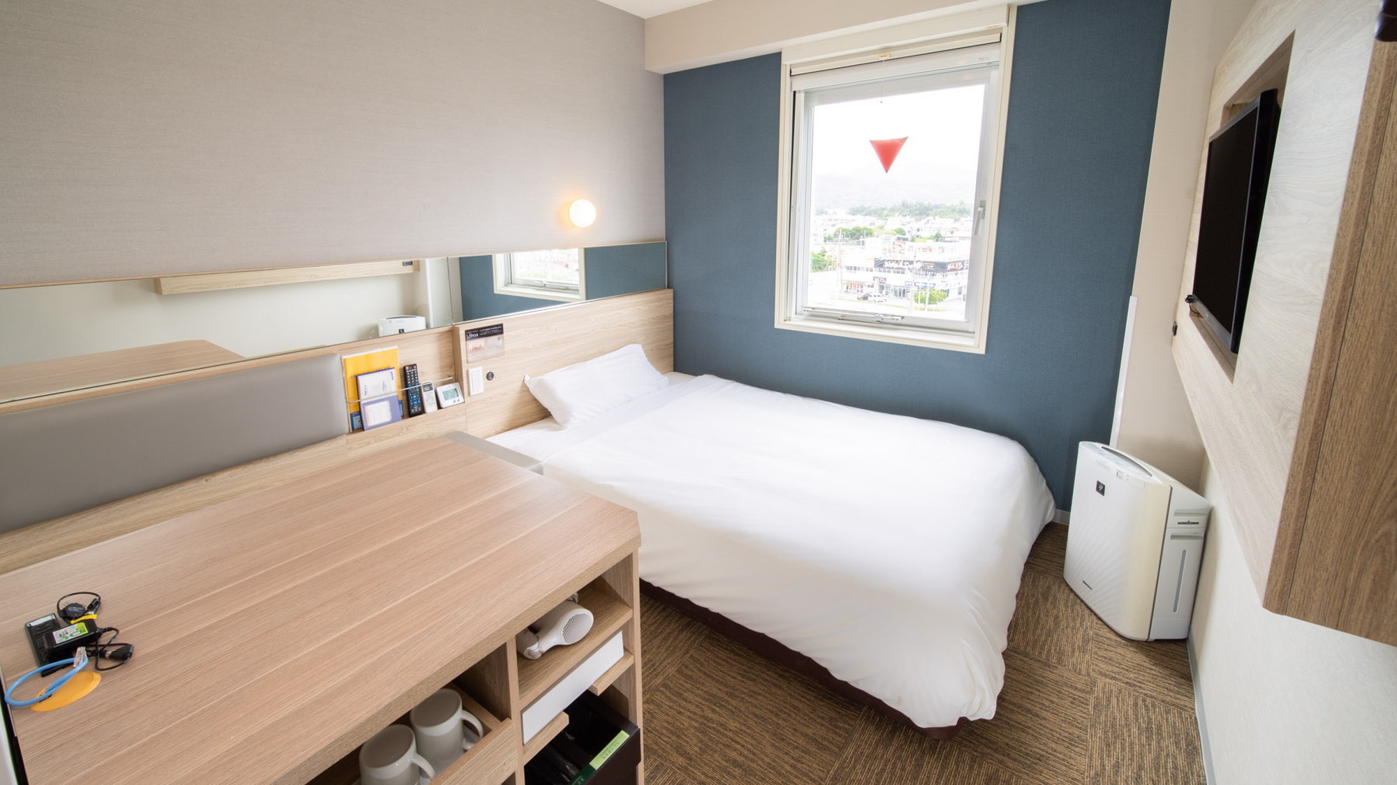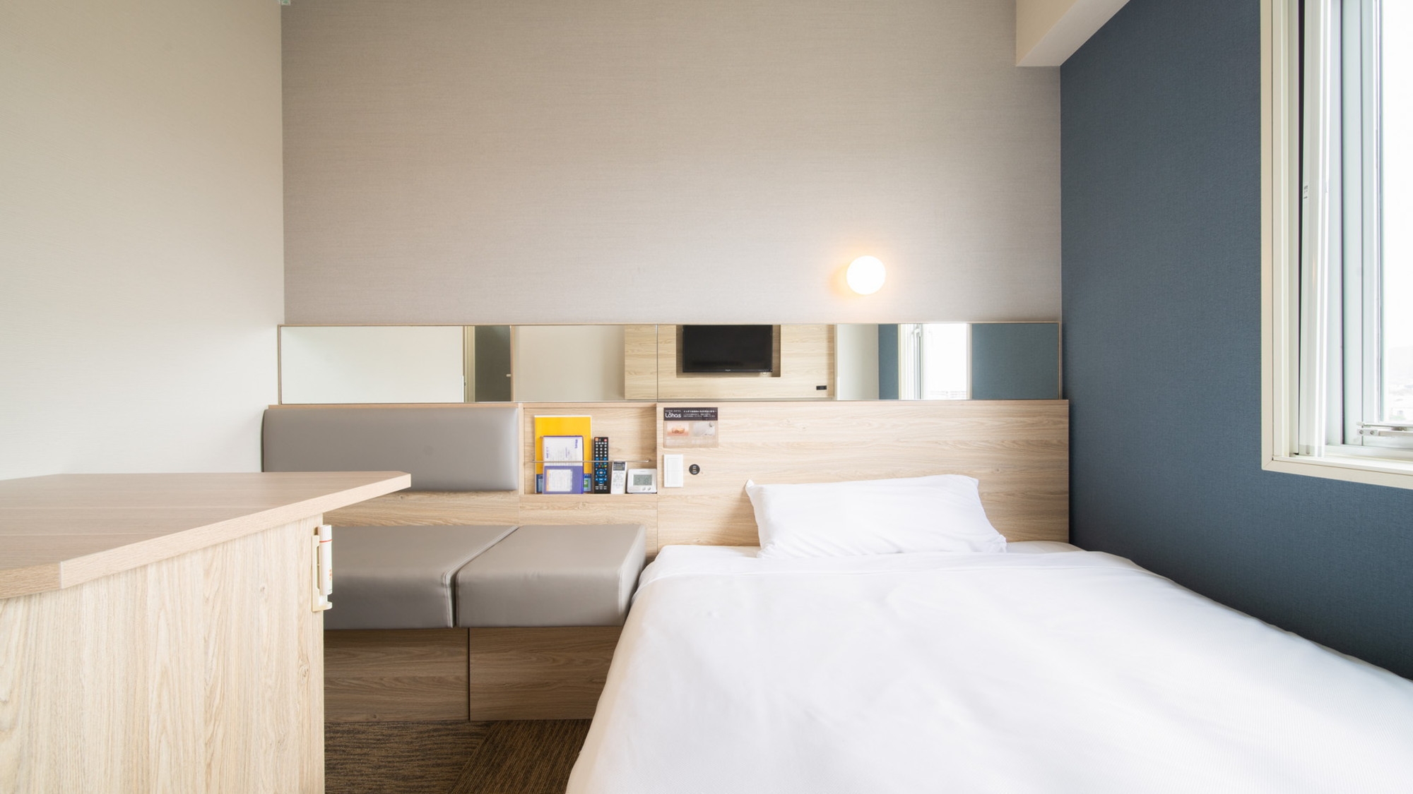 150cm幅のワイドベッド+広々デスクの【エクストラルーム】です。 広々デスクで仕事や作業がしやすいお部屋です。