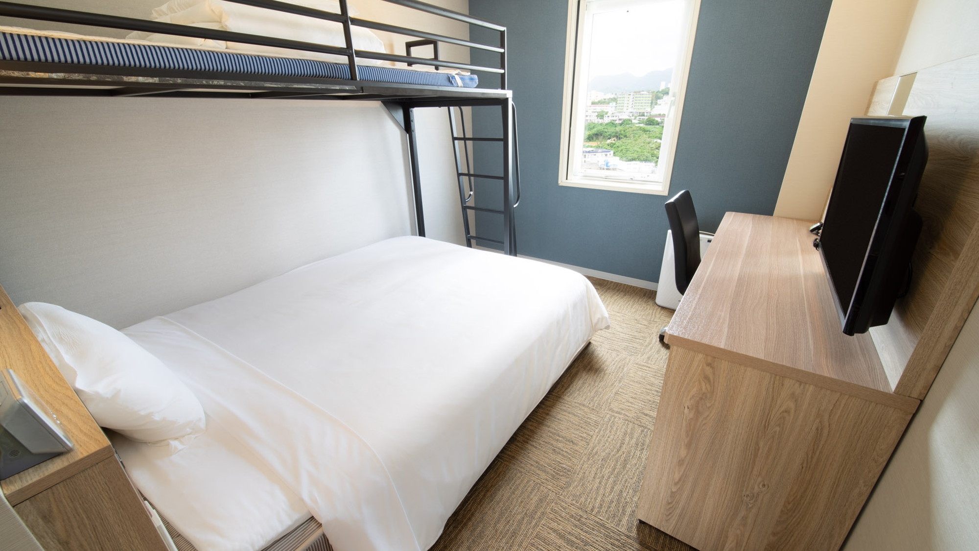 ダブルサイズのワイドベッドとお子様に人気のロフトベッド付の【スーパールーム】です。 ご家族にお勧めです。