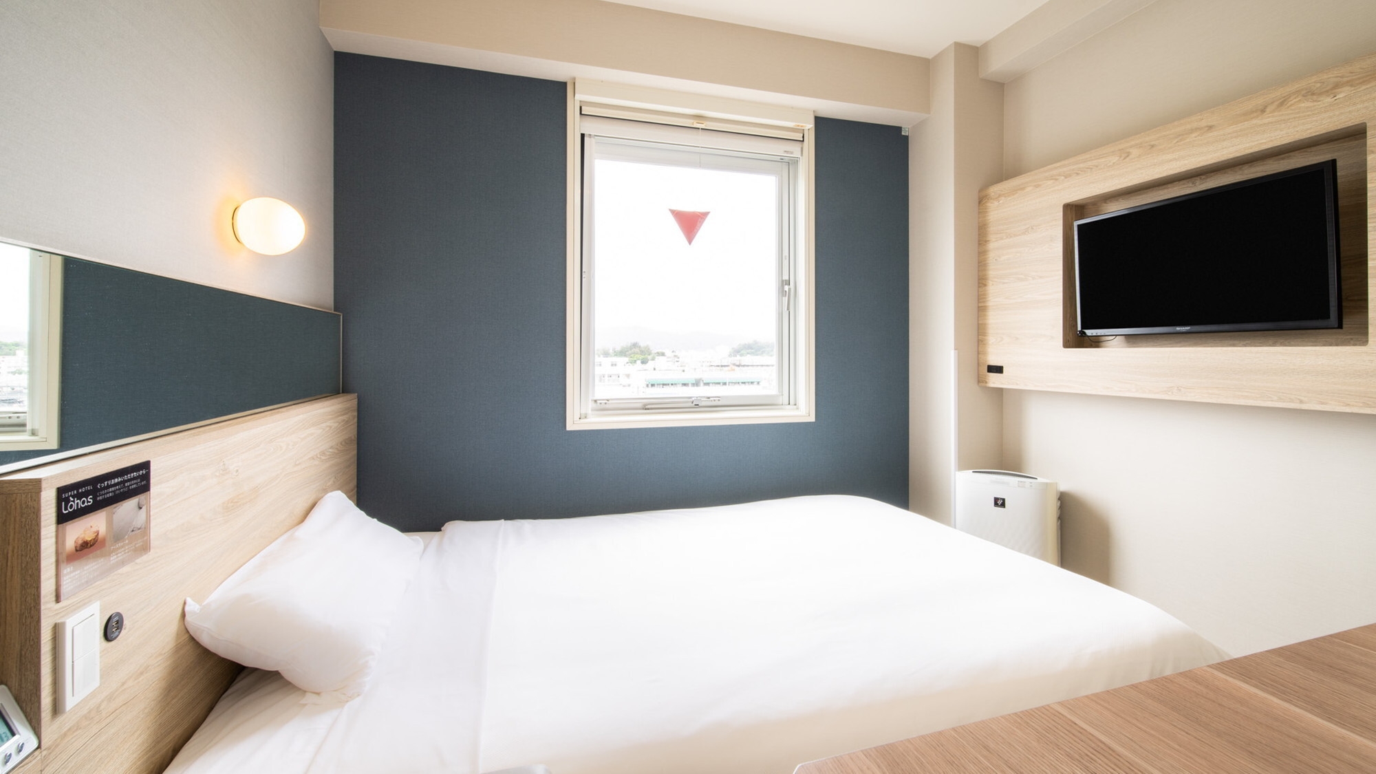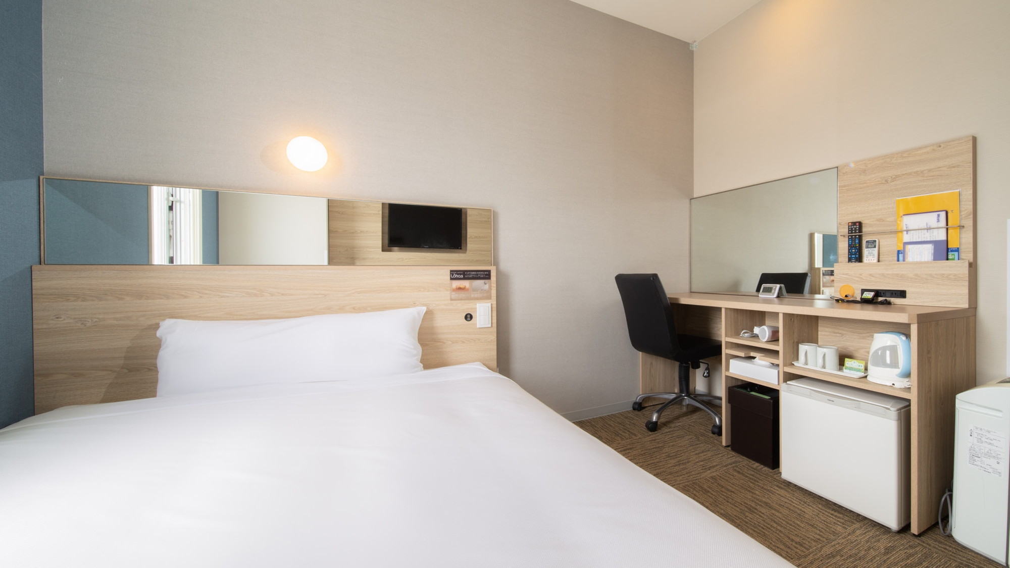 スーパーホテルで最もスタンダードなお部屋である【スタンダードルーム】です。 150cm幅のダブルサイズのワイドベッドでぐっすりお休み下さい。