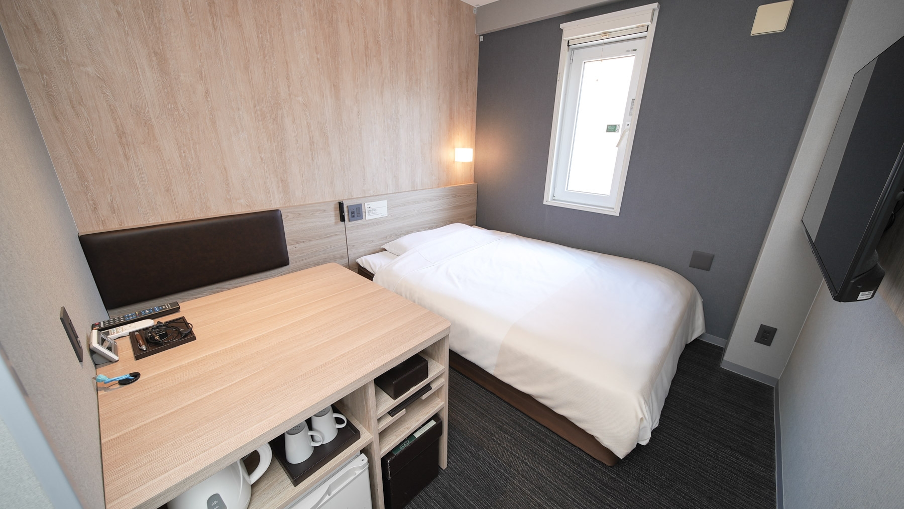 150cm幅のワイドベッド+広々デスクの【エクストラルーム】です。 広々デスクで仕事や作業がしやすいお部屋です。