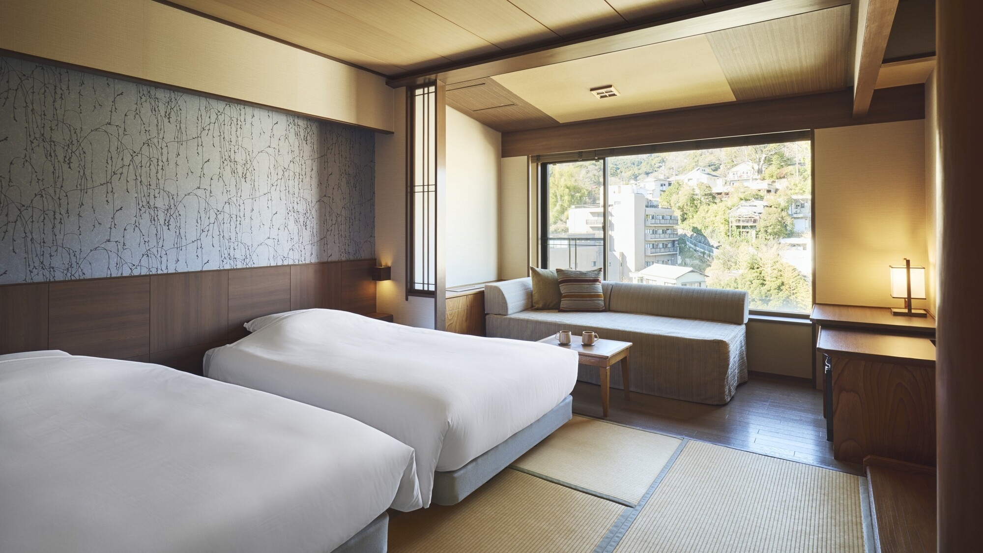 畳のお部屋にべッドを置いたタイプのお部屋です。3台めはエキストラベッドです。お風呂はホテル1階の大浴場をご利用ください。山側。