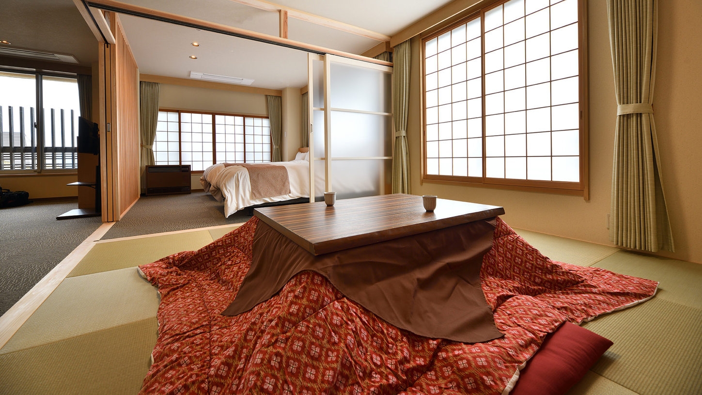 1日1室限定!源泉かけ流しの温泉風呂付きだから赤倉の天然温泉がお部屋で楽しめる!シモンズ製のツインベッドと和室とリビングでゆったりお寛ぎいただけます。
