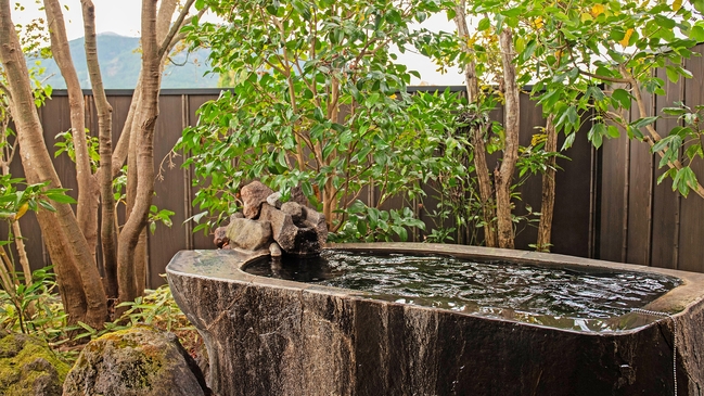 一枚岩をくりぬいた露天風呂付、和洋室2間の離れ一棟タイプです。セミダブルベッド2台配置。(3人目以降はお布団をご用意します)お庭を眺めながらお過ごしください。