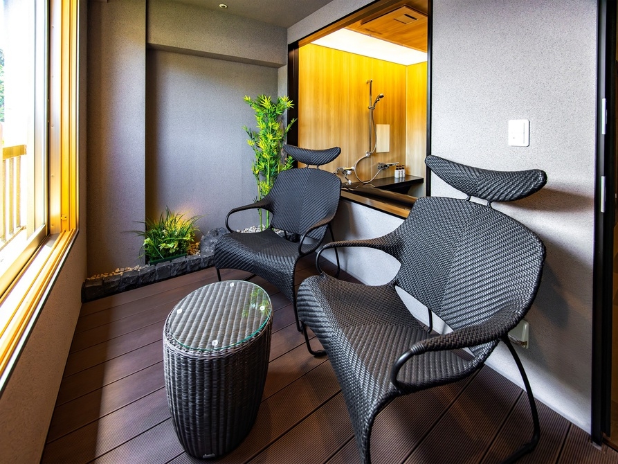 半露天の趣を愉しむ温泉付客室。開放感のある温泉風呂を備えており心安らぐひとときをお過ごしいただけます。3名様の場合1名様はソファベッドとなります。