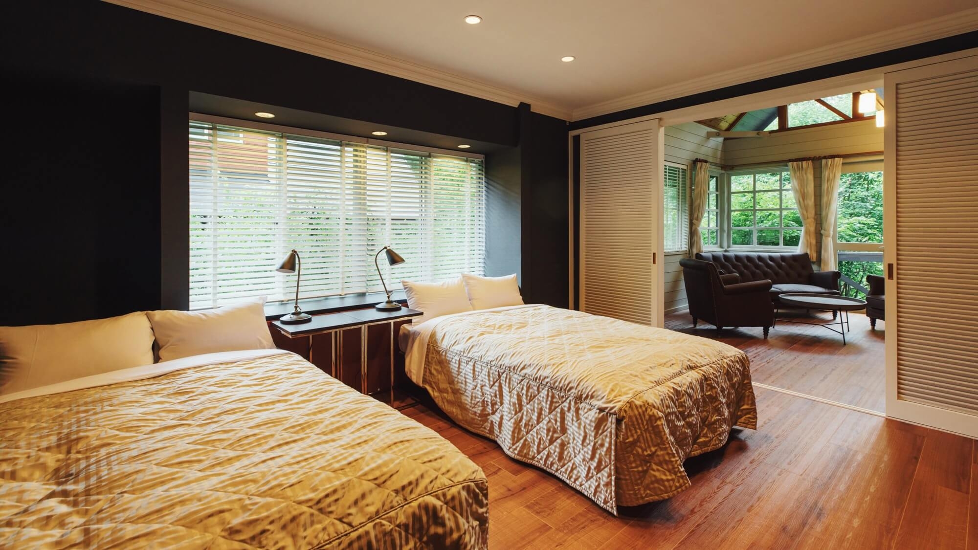 リビング、洋室(Wベッド×2)、シャワーブース、トイレ、テラス、個室露天風呂付客室(コテージ)