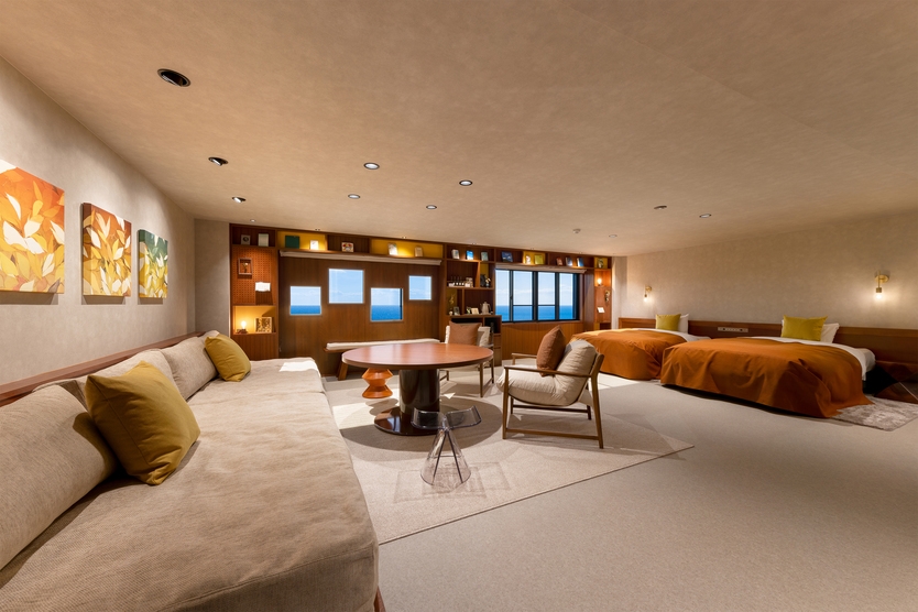 窓から海の見える広々とした角部屋。畳のダイニングルーム、居間、ベッドルーム(ツインベッド)、バスルーム。※3名様以上の場合はお布団をご利用いただけます。