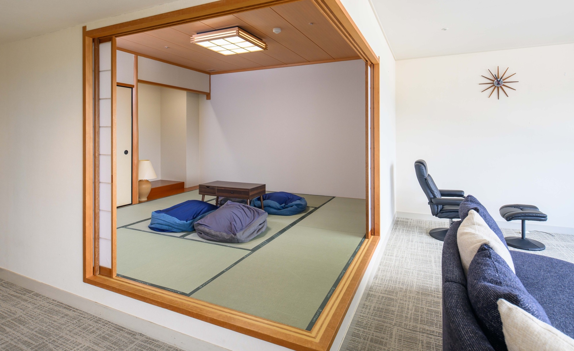 和室、布団4組(布団敷きはセルフ)。TV、Wi-Fi、ケトル、冷蔵庫、バスタブとシャワー、セーフティボックスを完備。布団不要の未就学児は3人まで。