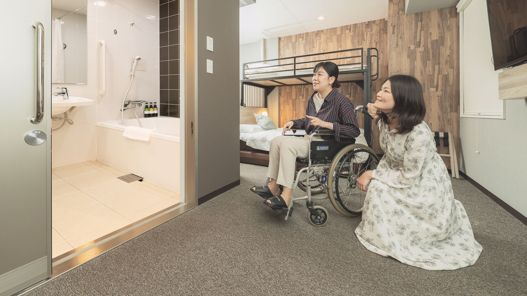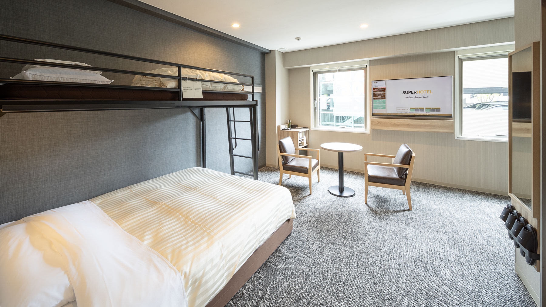 ダブルサイズのワイドベッドとお子様に人気のロフトベッド付の【スーパールーム】です。 ご家族にお勧めです。