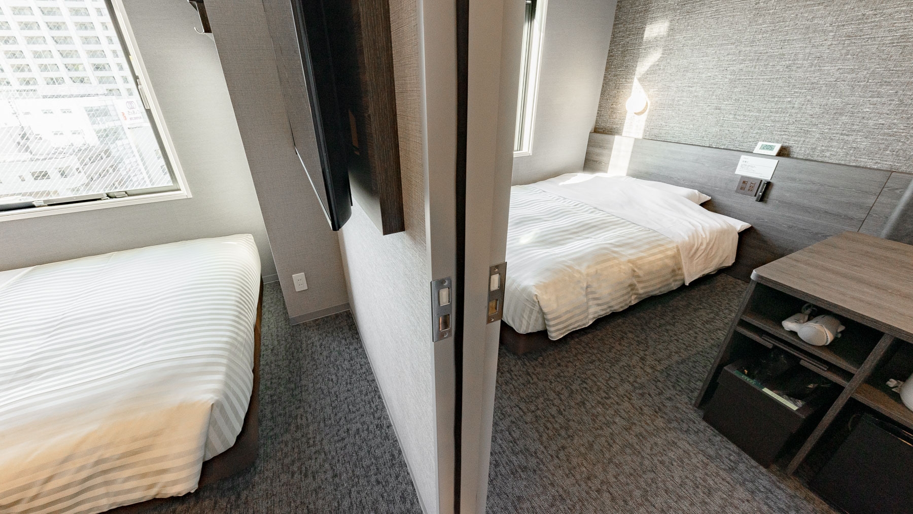 150cm幅のダブルベッド2台。【コネクティングルーム】 エクストラルームを2部屋ご準備させて頂きます。注:お部屋の最大定員は4名様まで(0歳児も含む)