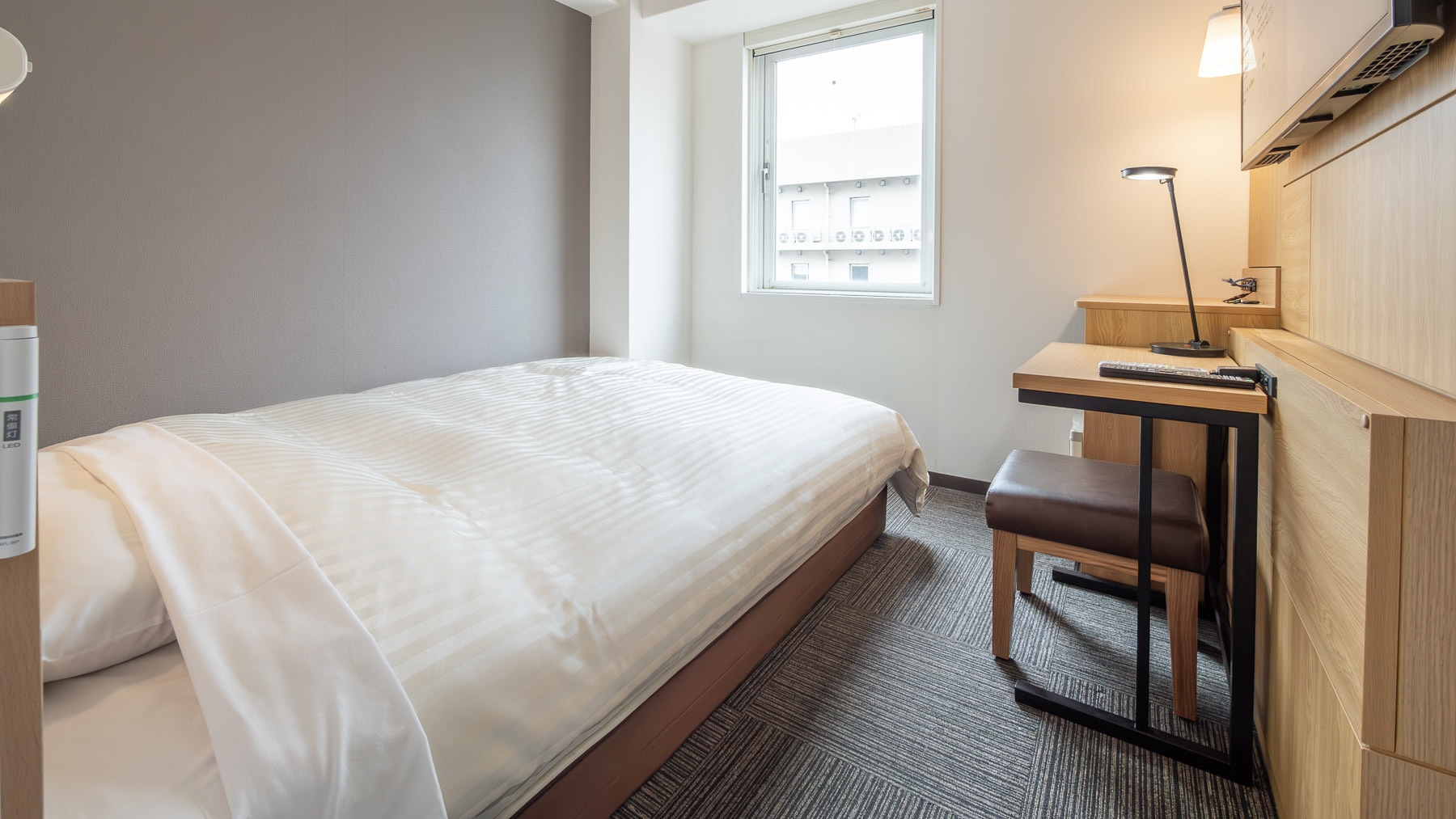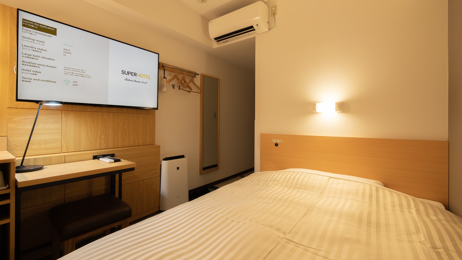 スーパーホテルで最もスタンダードなお部屋である【スタンダードルーム】です。150cm幅のダブルサイズのワイドベッドでぐっすりお休み下さい。