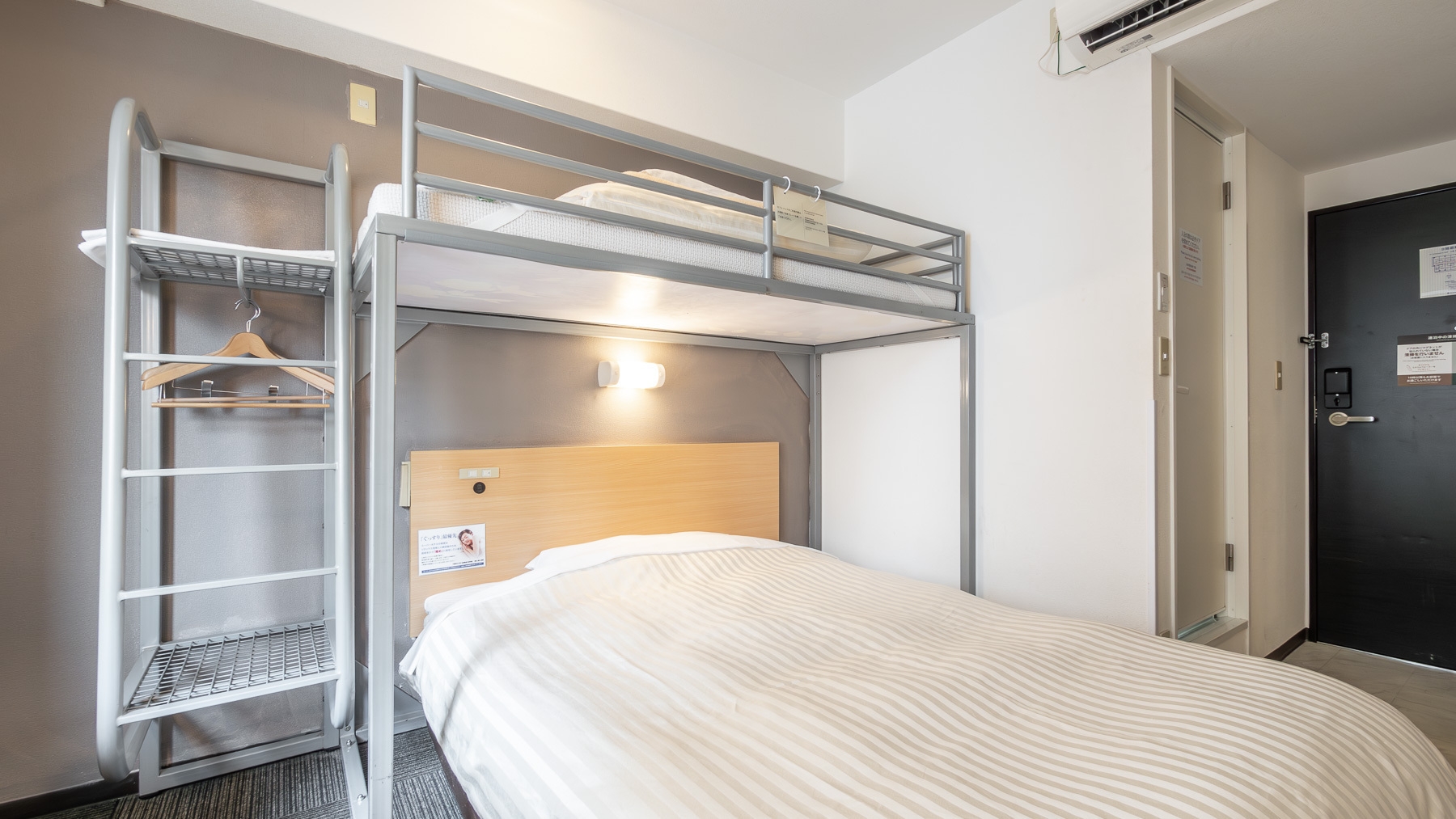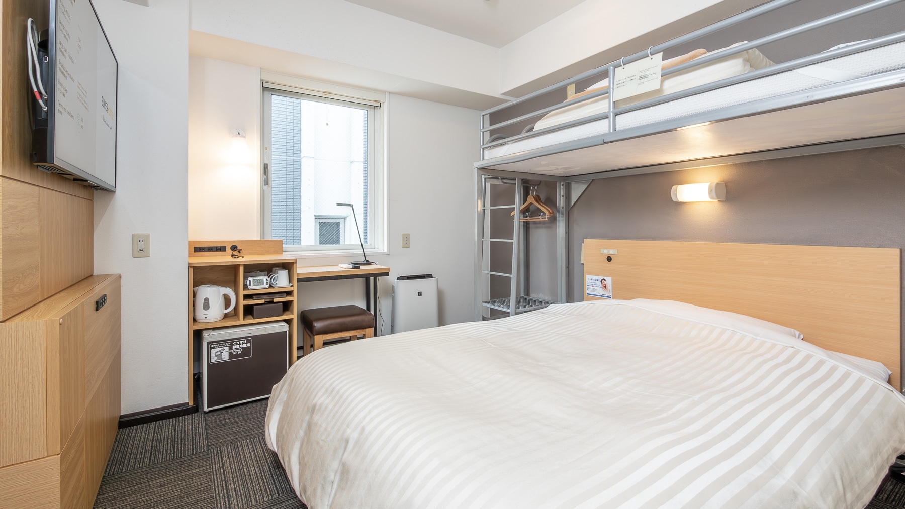 ダブルサイズのワイドベッドとお子様に人気のロフトベッド付の【スーパールーム】です。ご家族にお勧めです。