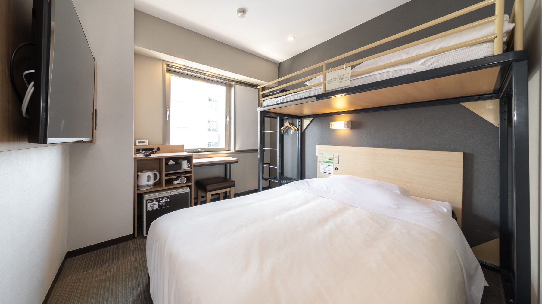 ダブルサイズのワイドベッドとお子様に人気のロフトベッド付の【スーパールーム】です。ご家族にお勧めです。