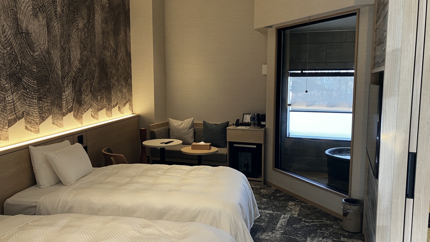 ベルツの森を臨むバスルームで寛ぎのひとときをお過ごしいただけるツインルーム。長期滞在にもおすすめ。(温泉ではございません)(バスルーム付/約35平米/定員2名)