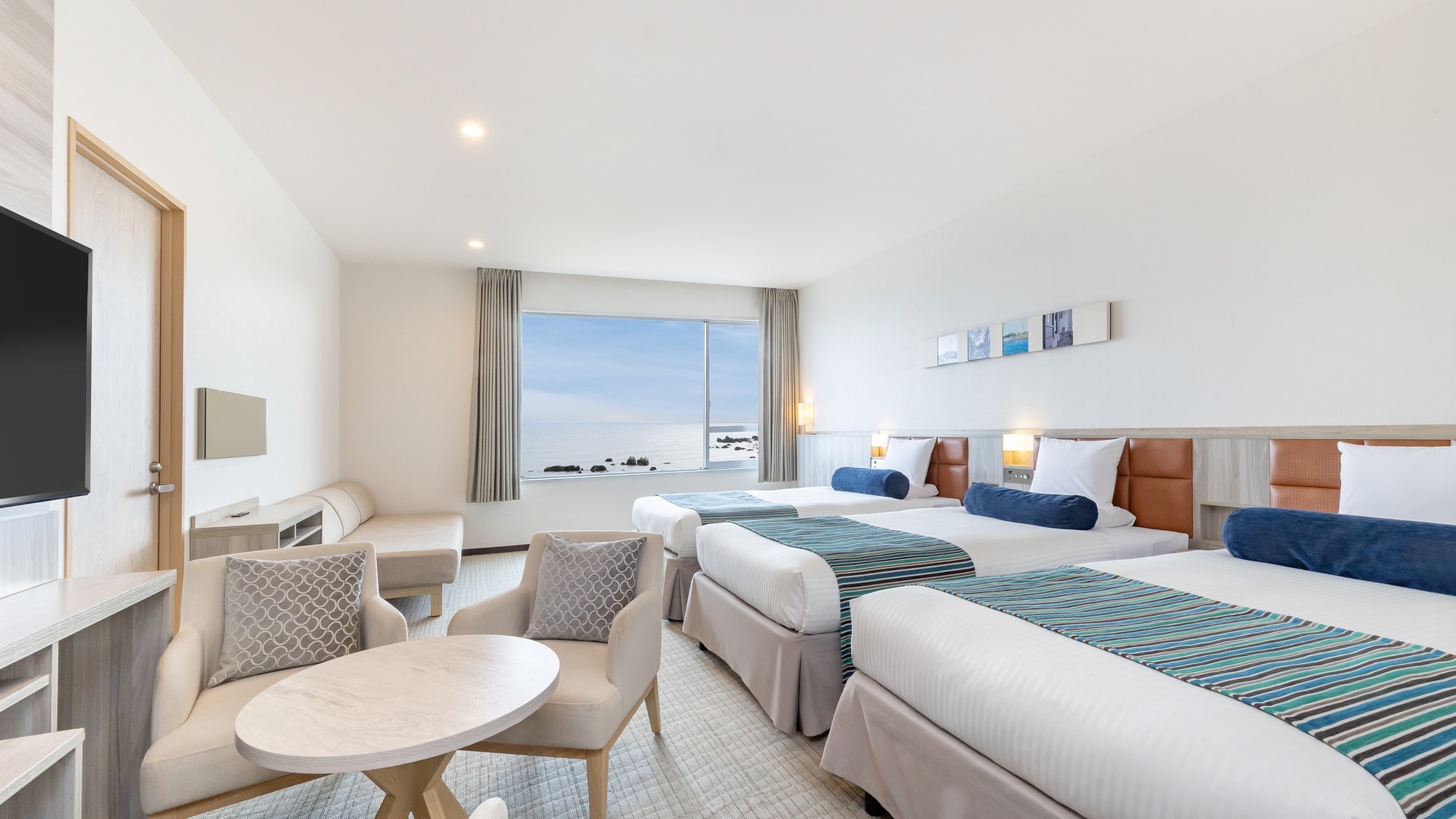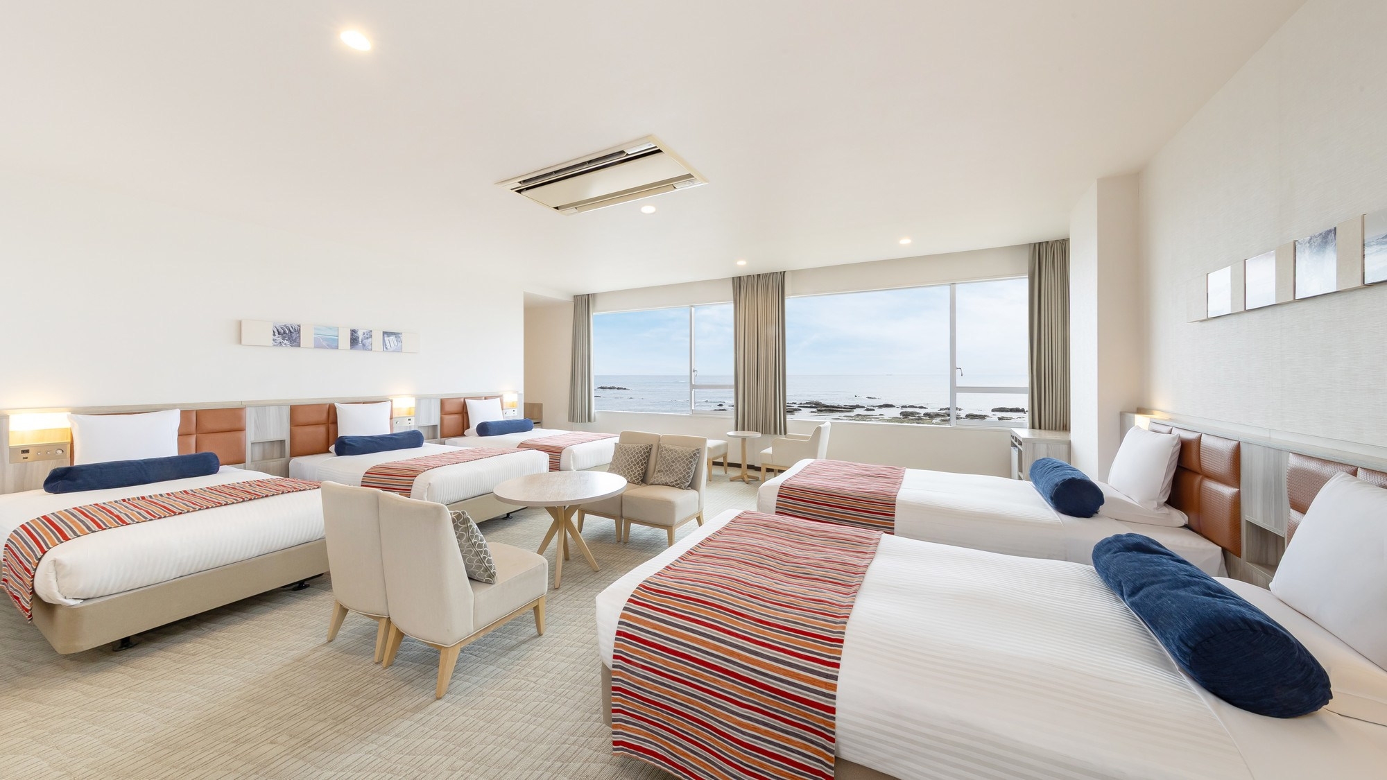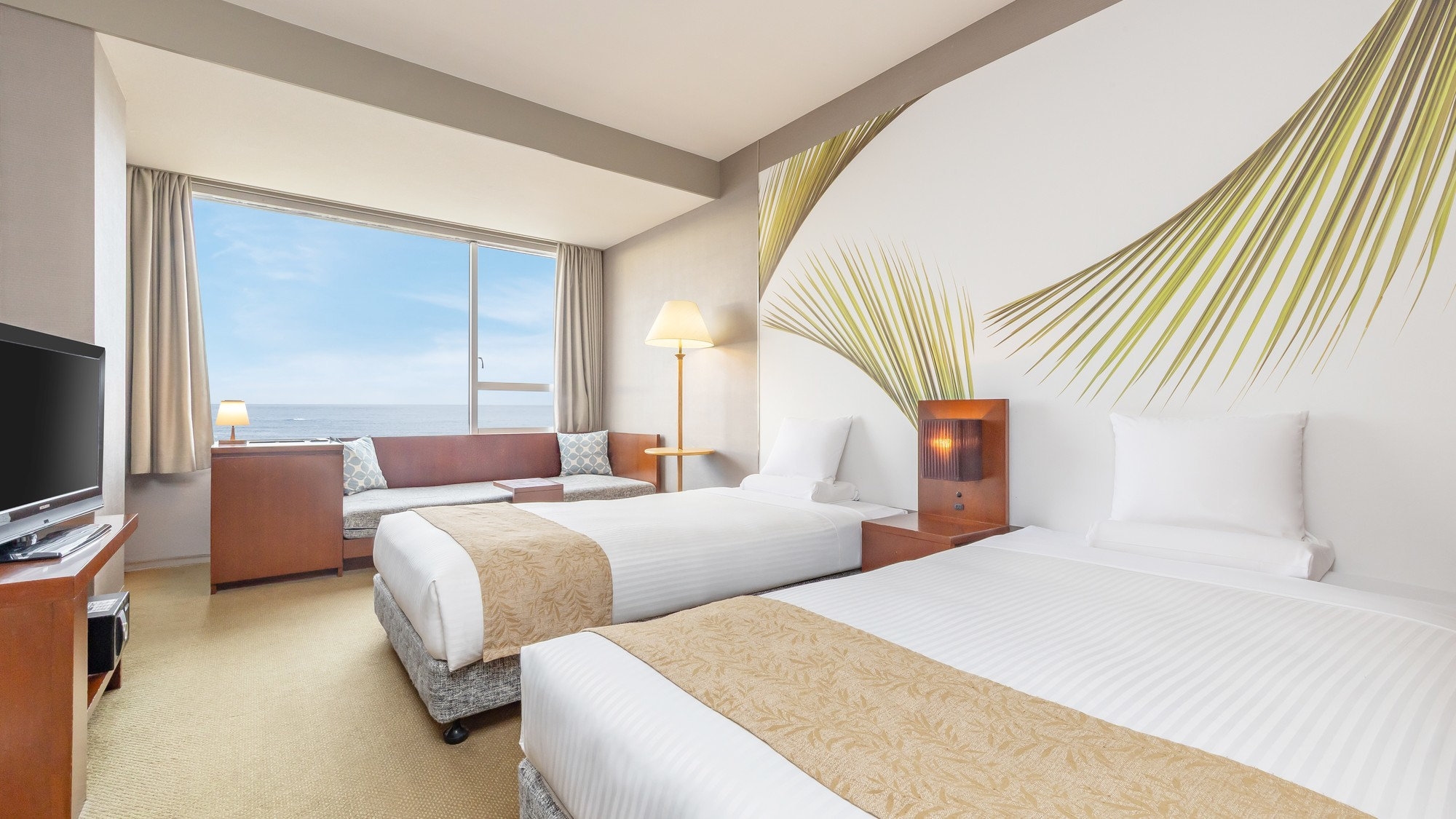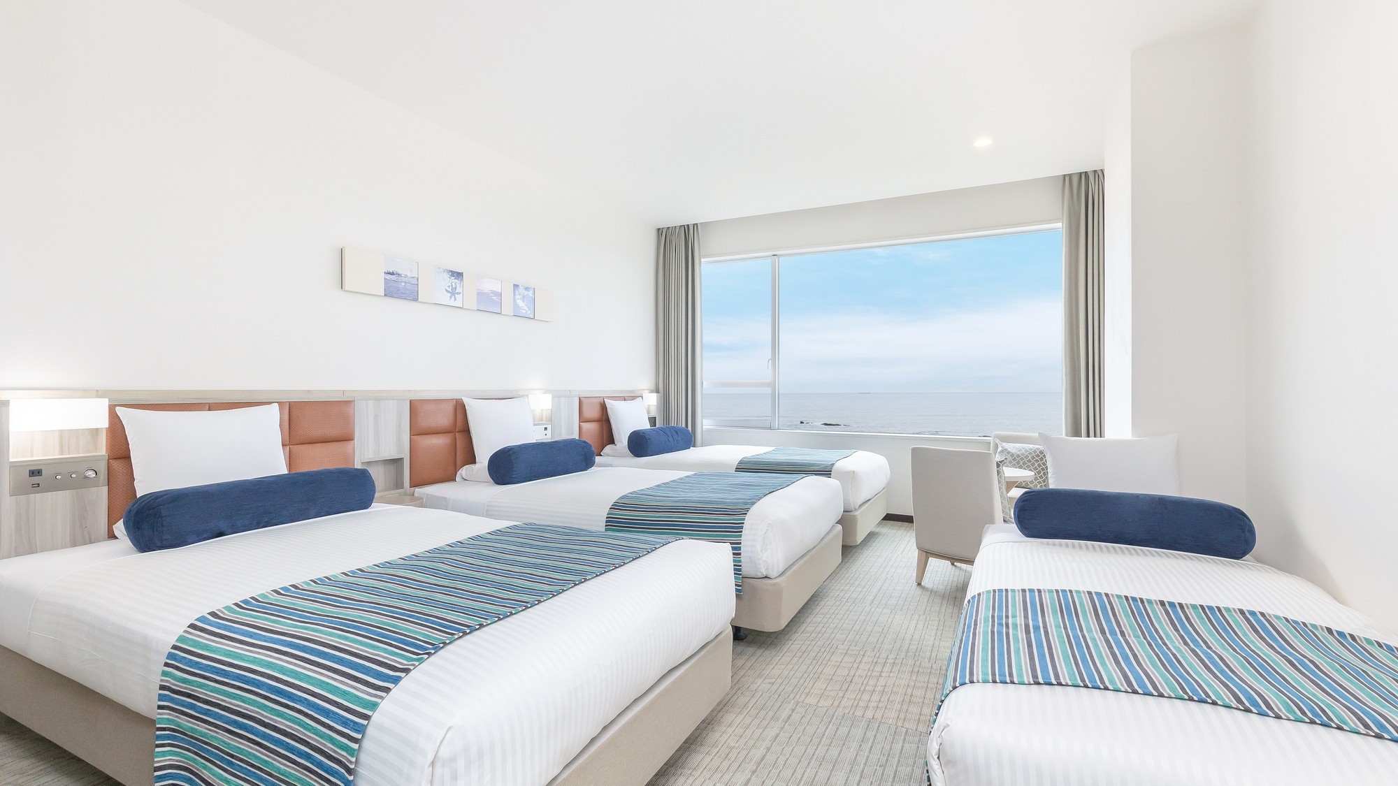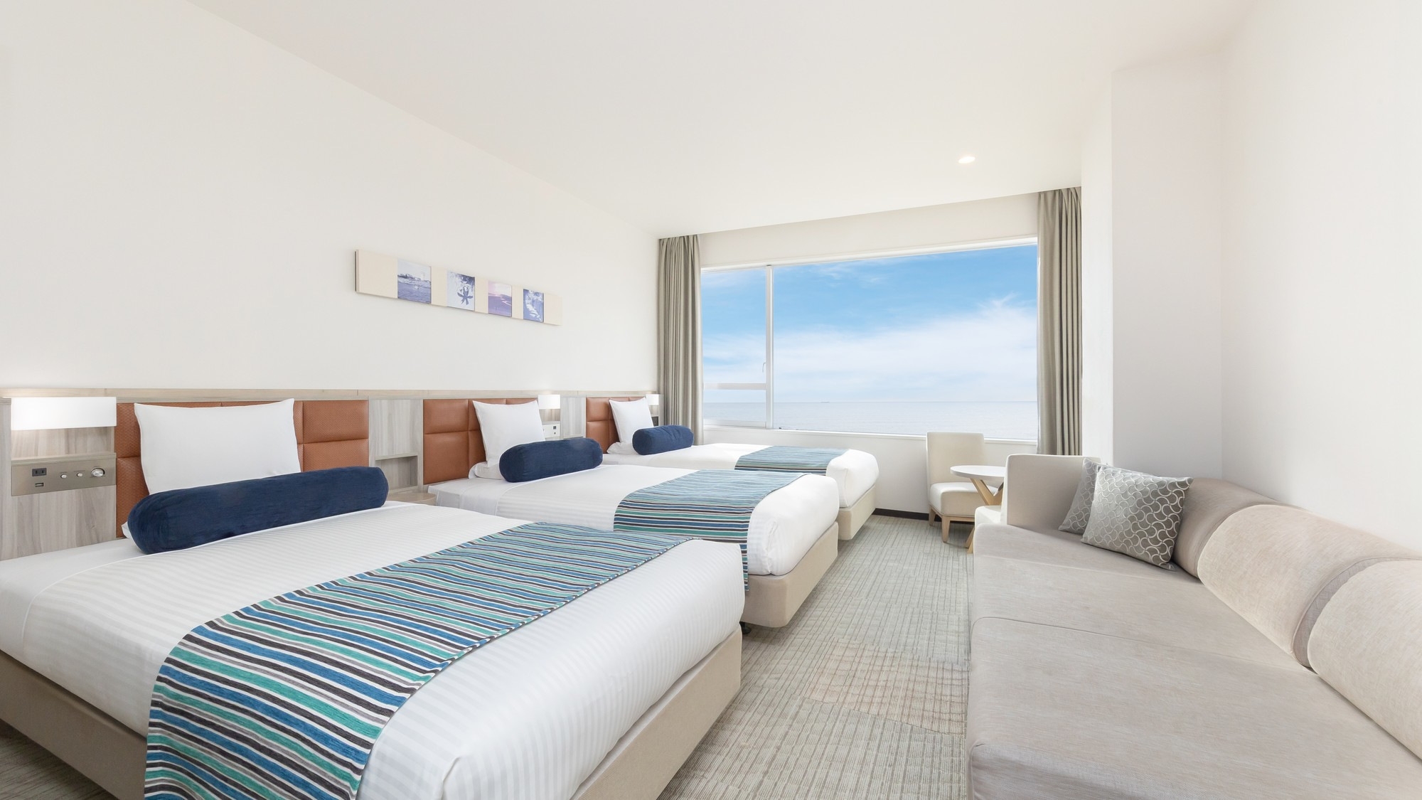 51平米の広々としたオーシャンビュールームに、シングルベッド3台と3名でご利用いただけるハリウッドツインベッドを設置。最大大人6名様までご利用いただけます。