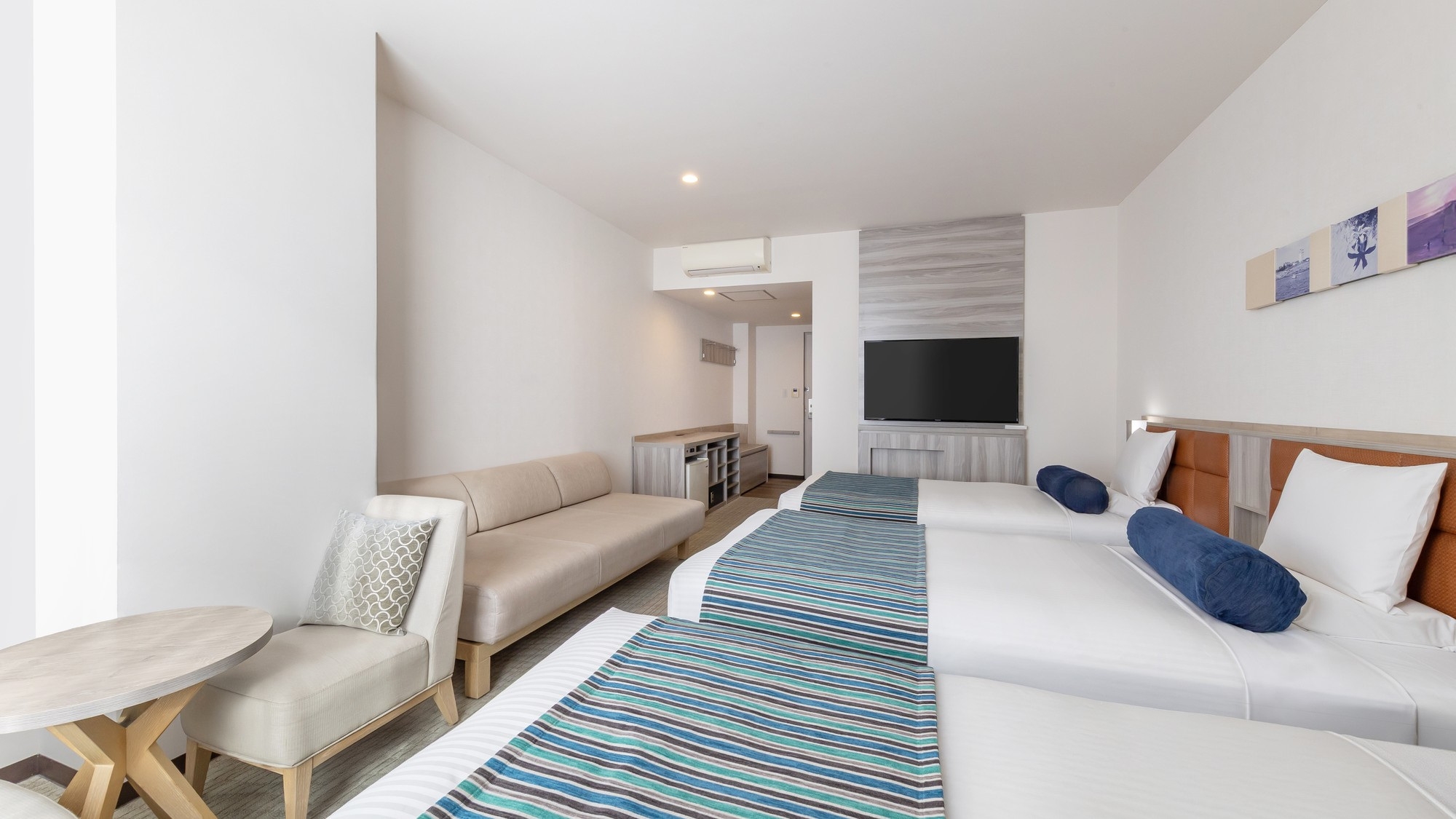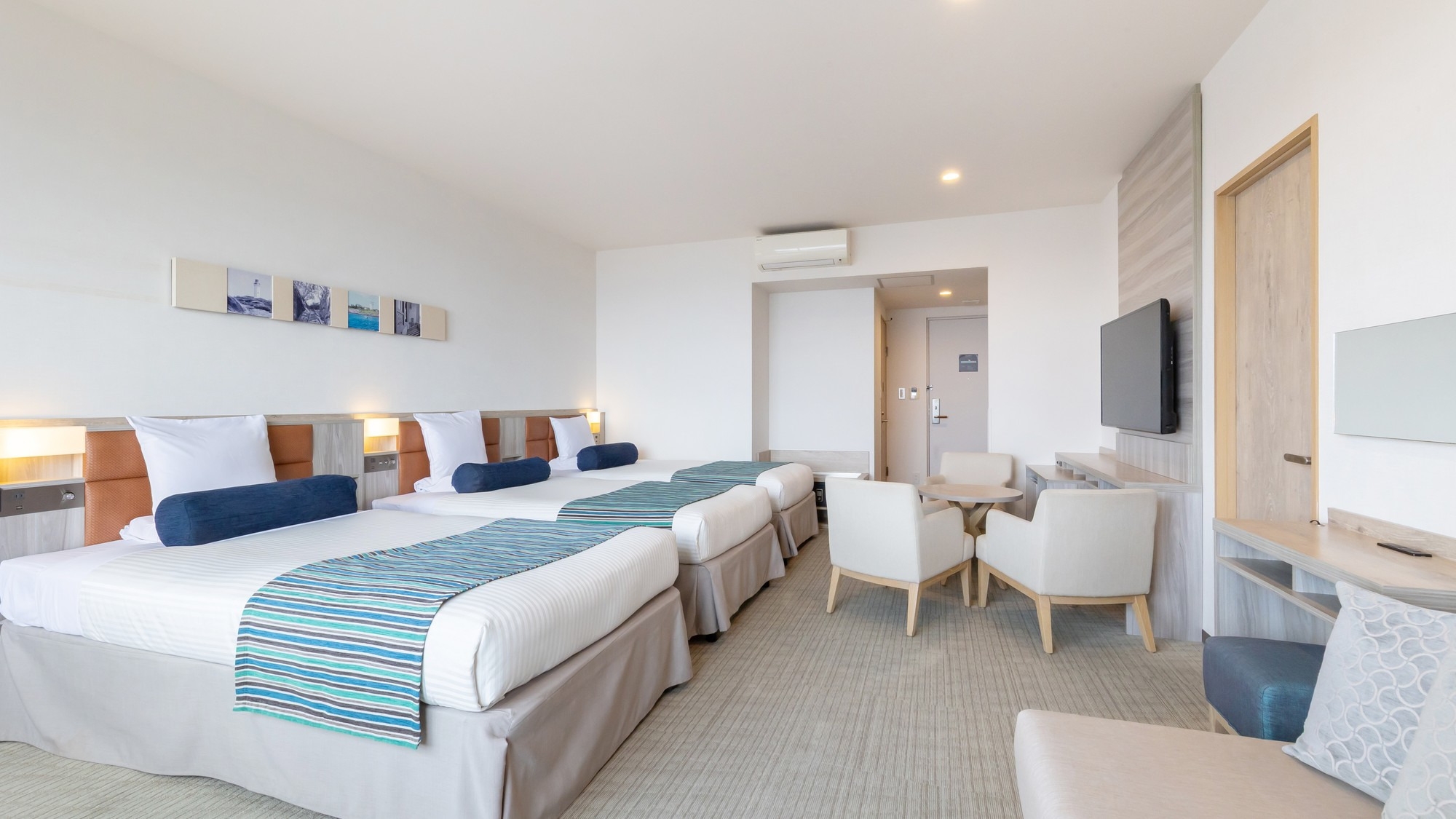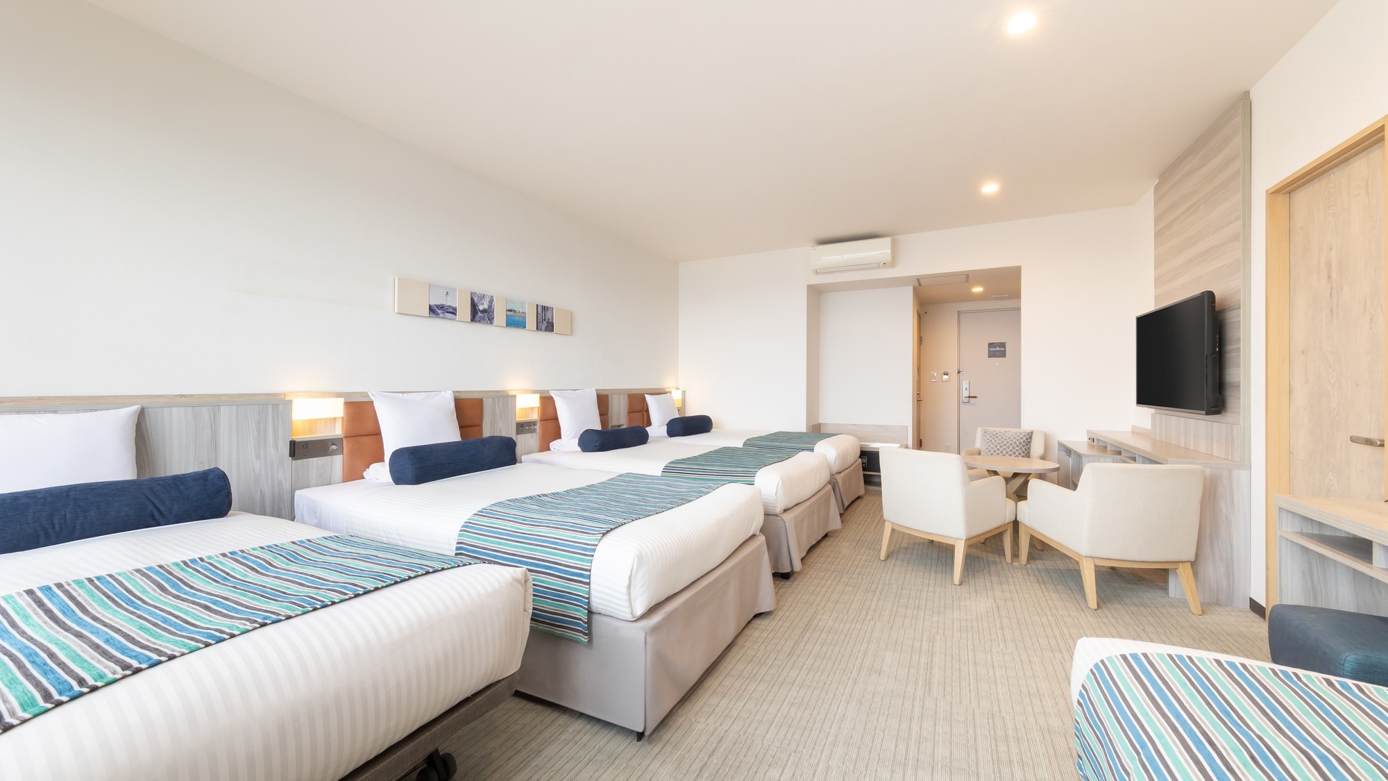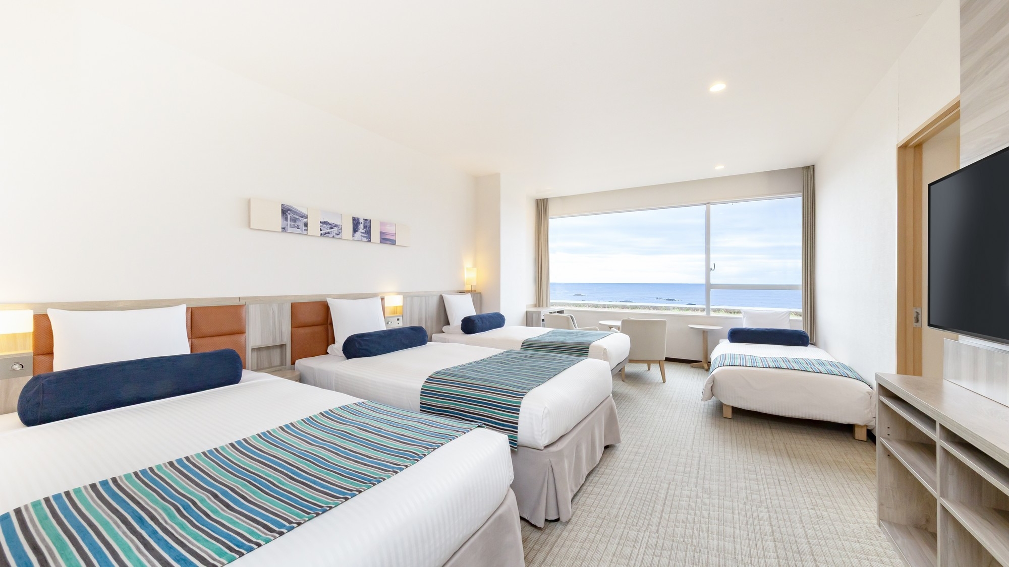 51平米の広々としたオーシャンビュールームに、シングルベッド3台と3名でご利用いただけるハリウッドツインベッドを設置。最大大人6名様までご利用いただけます。