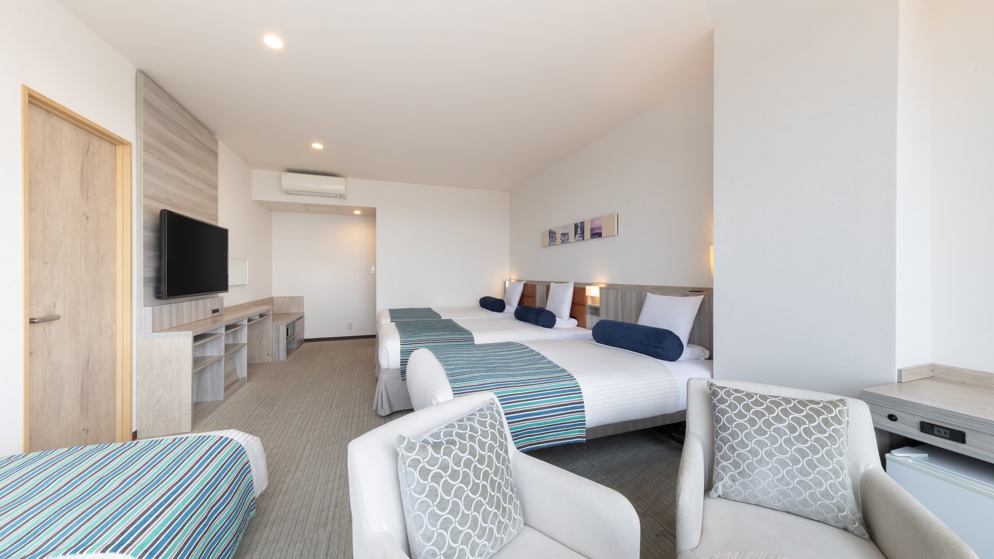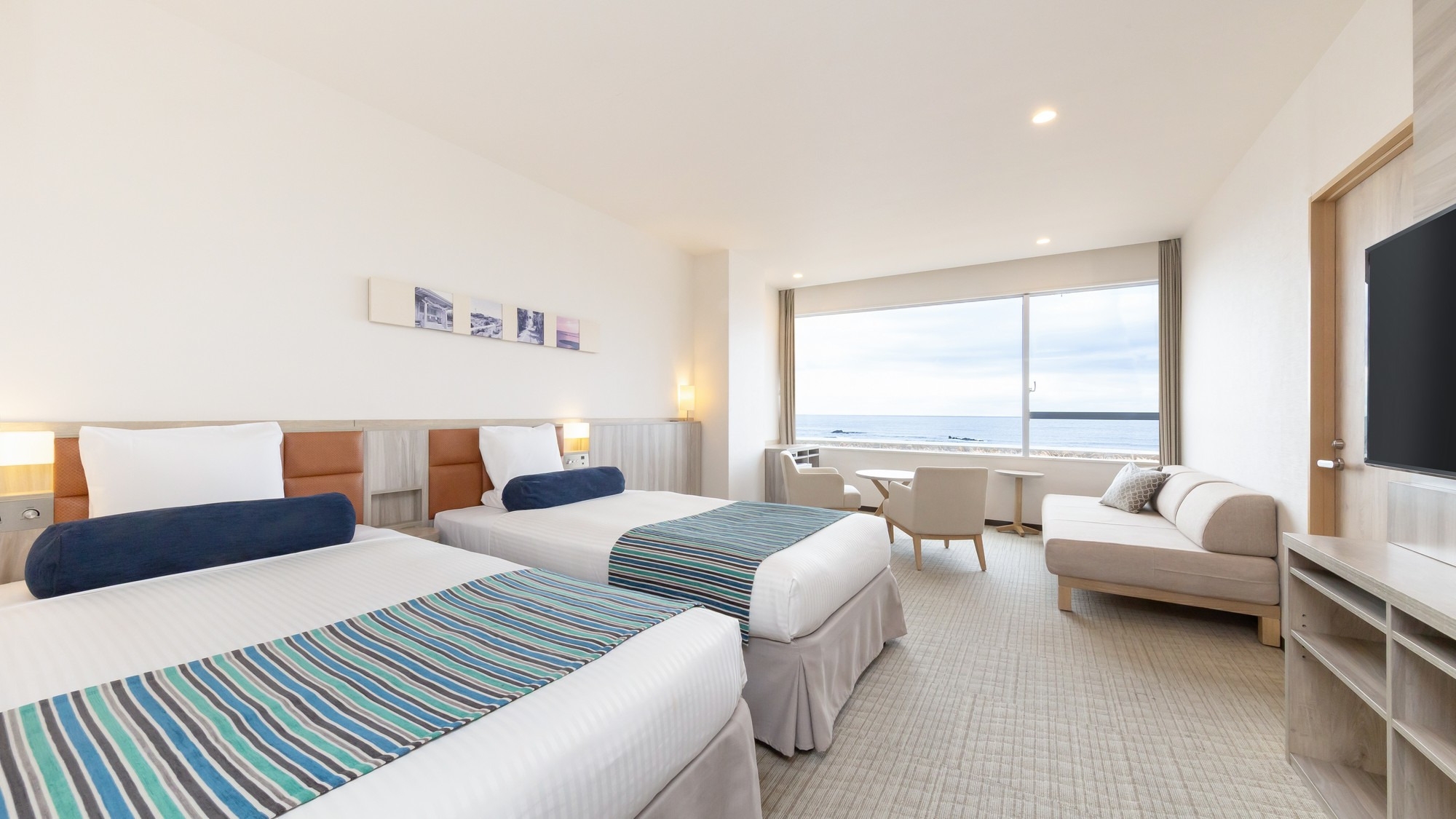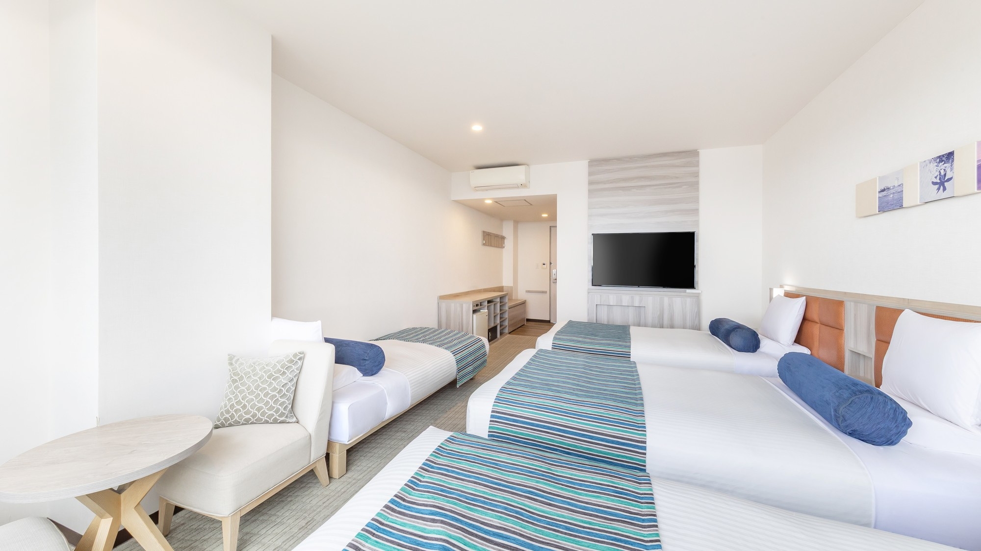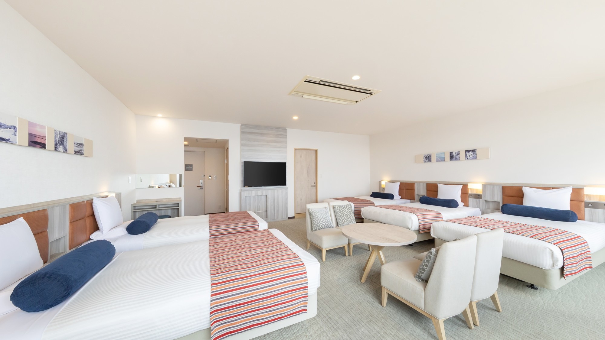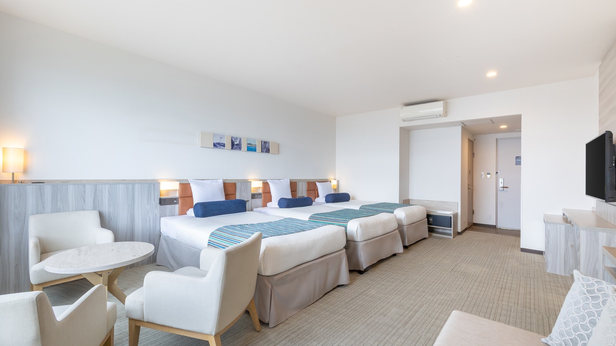 51平米の広々としたオーシャンビュールームに、シングルベッド3台と3名でご利用いただけるハリウッドツインベッドを設置。最大大人6名様までご利用いただけます。