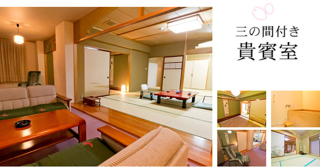 | 12.5畳の広いお部屋に、 4畳と6畳のお部屋が付いた豪華なお部屋。 「家族みんなで同じ部屋に泊まりたい」「大人数で泊まりたい」という方にお勧めです。実際に、同級会や家族旅行でご利用になられてるお客さまもいらっしゃいます。 お部屋内には専用のヒノキ風呂があり、お部屋の中でも檜が香る温泉がお楽しみいただけます。 | ![]() |
