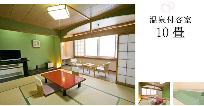 | 10畳の和室に、専用内風呂がついたお部屋。 ご夫婦やカップル、ちょっとしたグループ旅行におすすめ。 窓からは烏帽子山が見渡せ、 赤湯の自然を間近に感じられます。 専用内風呂で、いつでも温泉を楽しめます。 | ![]() |