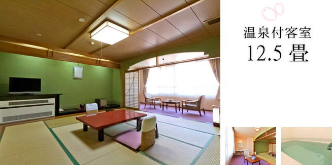広々としたお部屋を二人で贅沢に。大人数で賑やかに。 12.5畳の広いお部屋に、温泉流れる専用内風呂がついたお部屋です。 | ![]() |