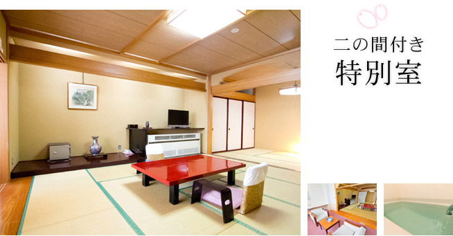 2の間をゆるりとお使いいただける、特別仕様。 12.5畳の広いお部屋に、6畳のお部屋が付いた特別客室。 | ![]() |