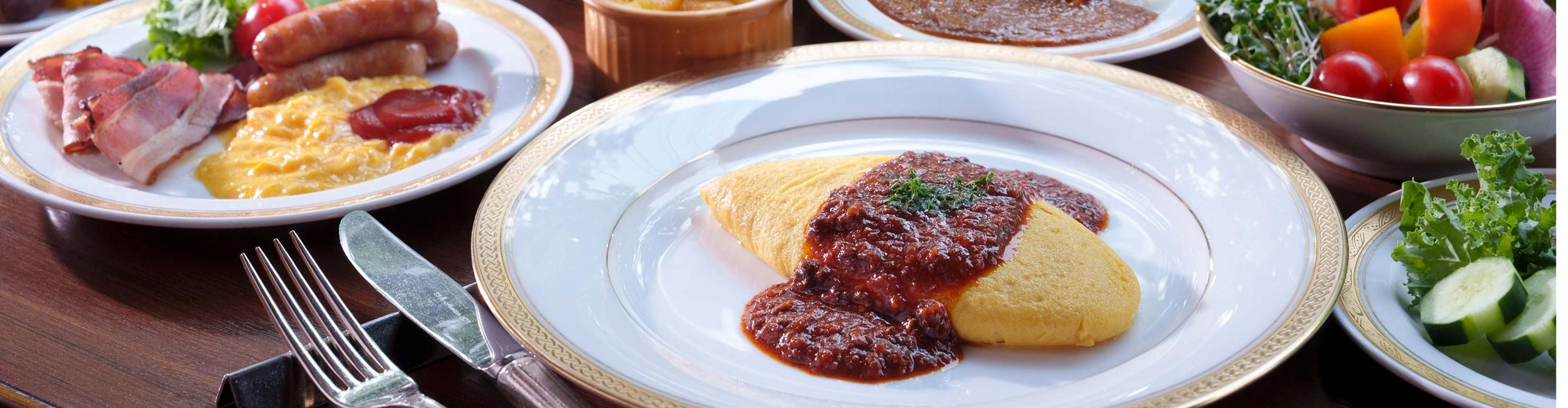 オムレツは、新鮮な卵を使用し、ホテル特製ミートソース、キーマカレー、明太クリームなどお好みのソースをお選びいただけます。シェフが丁寧に調理するふわふわオムレツは、栄養満点で朝から元気になれる一皿です。(ソースの種類は、変更となる場合がございます。)