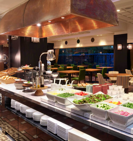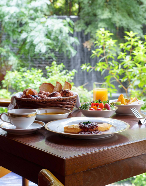 1969年の開業以来、絶えることなく流れる全長70mの滝を望みながら、九州産・国産の食材を使用した和洋ブッフェをお楽しみいただけます。シェフが目の前で調理するふわふわのオムレツ、大人気の海鮮丼、ホテルメイドのパンや伝統のビーフカレーなど、朝のエネルギーを満たす美味しい料理をご堪能ください。