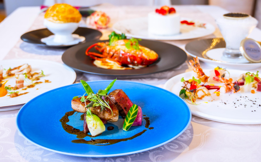 ホテル1階のレストランでは、滝を眺めながら楽しむ本格フレンチのコース料理が味わえます。彩り豊かな前菜からメイン、デザートまで、シェフの技が光る一皿一皿に心が躍ります。記念日や特別な夜にもふさわしい贅沢な時間です。