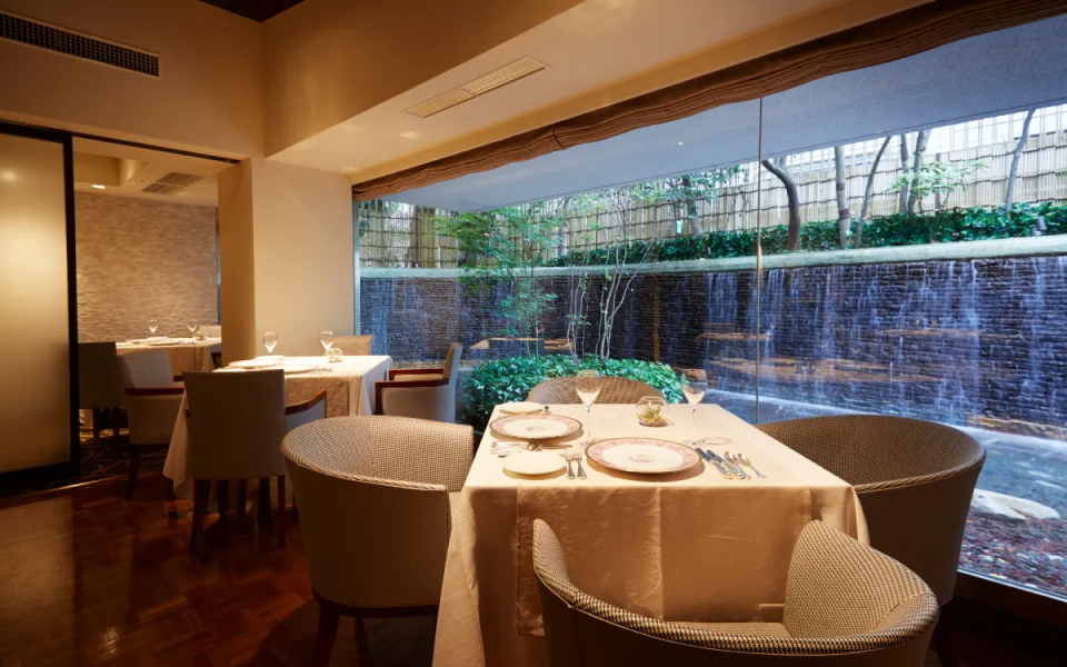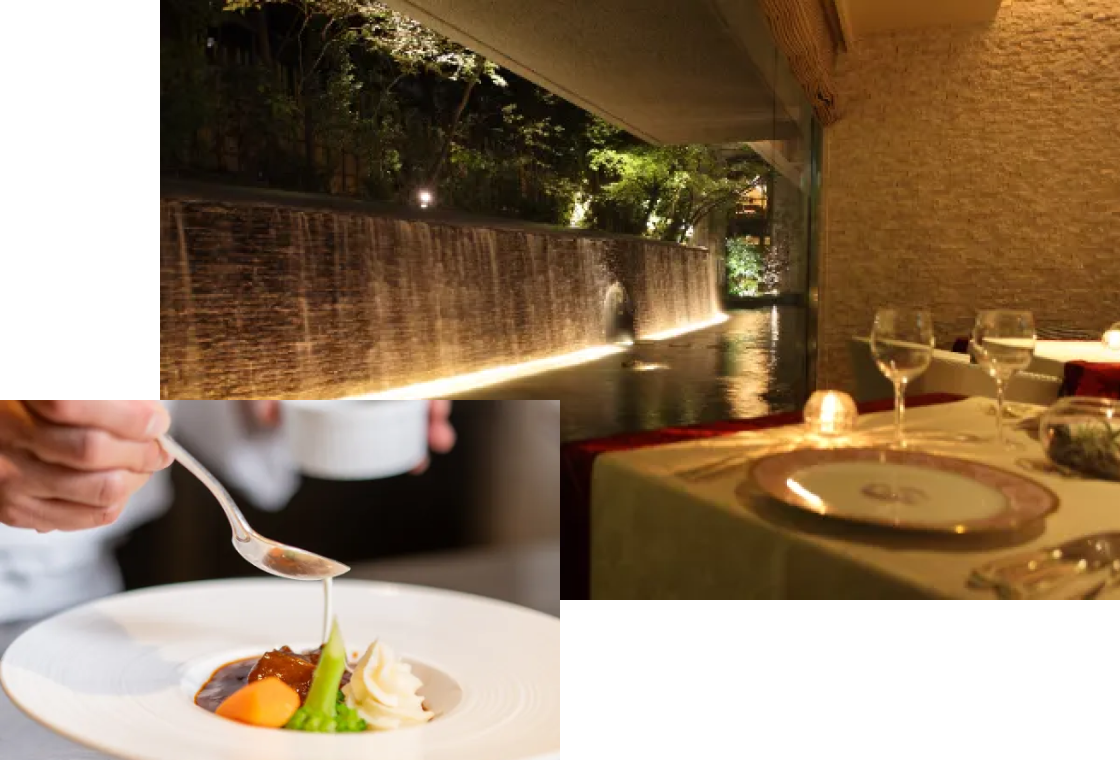 趣向を凝らしたコース料理が充実。フランス語「カスカドゥ」は日本語で「滝」。ガラス越しに水の流れ落ちる様を眺めながら、お食事いただけます。