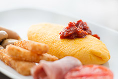 お好みでカスタマイズしたオムレツをシェフが目の前で焼き上げます。料理長のレシピで仕上げるトマトケチャップは、ほんのり甘く、シナモンがアクセント。