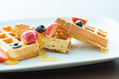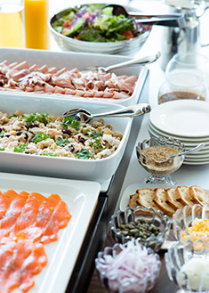 毎朝ホテルのオーブンで焼き上げる数々のブレッドの中でも、おすすめは「カンパ-ニュ」。黒ビールの種でおこし、18時間も発酵させる製法にこだわった風味豊かなパンです。本日のスープに浸したり、ハムとチーズでサンドイッチにしたり、オリーブオイルやジャム、はちみつと一緒にいただいたり、お好みのスタイルでどうぞ。忙しいビジネスパーソンには「Grab & Go」。ドリンクとともにテイクアウトしていただけます。