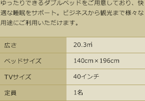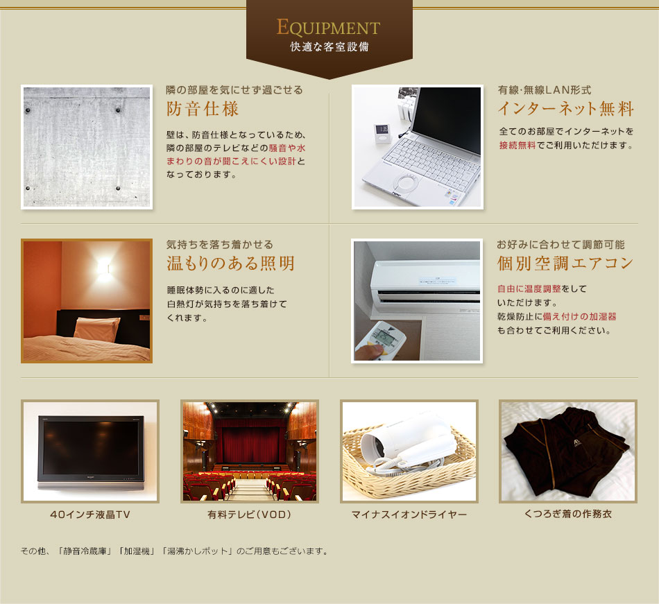 | 有料サービス | コピー、FAX、傘、ダンボール、宅配便、有料テレビ、コインランドリー、マッサージ、ソフトドリンク、アルコール、おつまみ 等 |