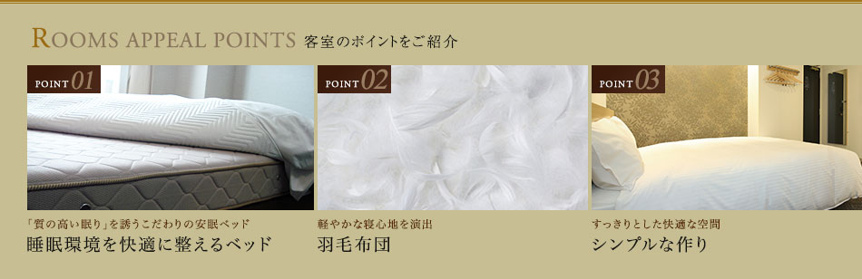 当ホテルは過ごしやすさを重視しており、心地よく眠りについていただけるようにベッドや布団、枕にこだわっております。
