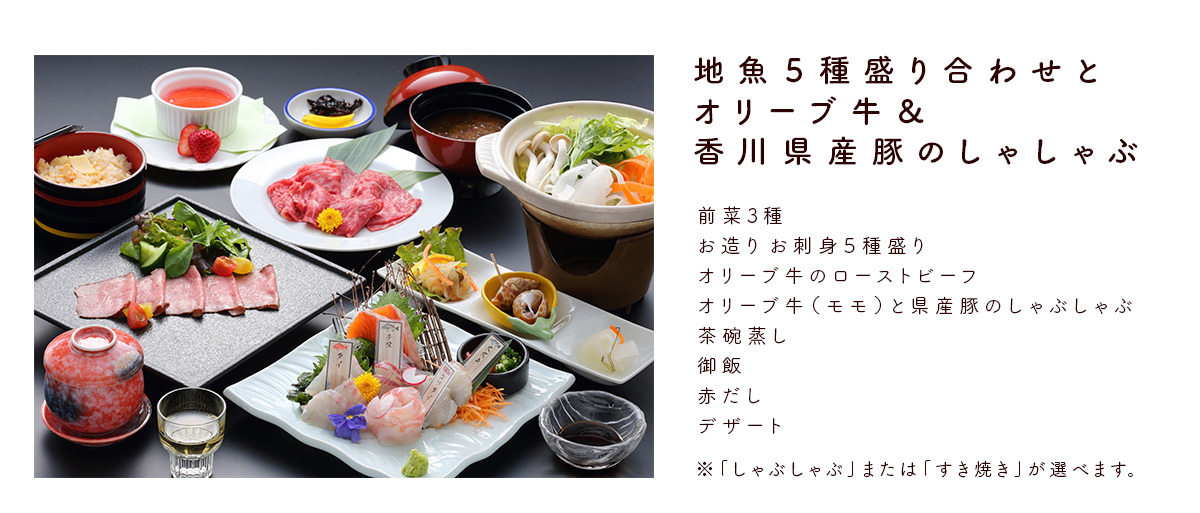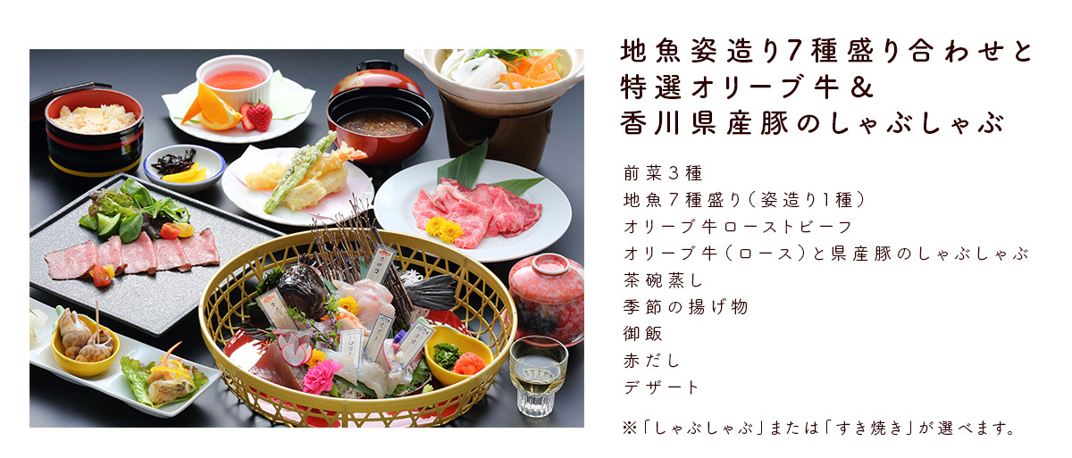 ![]() ≫【デラックス】地魚7種盛り合わせと特選オリーブ牛&香川県産豚のしゃぶしゃぶプランはこちら ![]() ≫【スタンダード】地魚5種盛り合わせとオリーブ牛&香川県産豚のしゃぶしゃぶはこちら