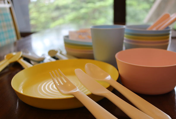 ブッフェ会場には、メラミン素材の食器やカトラリーをご用意。お子さま用の椅子もございます。