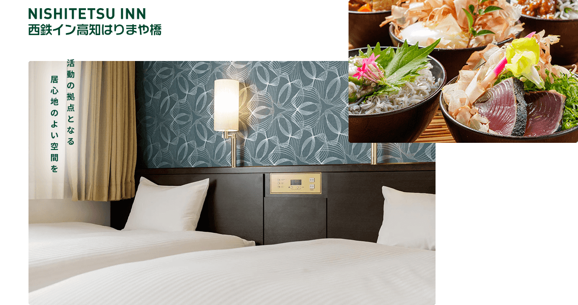 路面電車「はりまや橋」停留所の目の前すぐ、高知龍馬空港からはバスで約30分、JR高知駅からも徒歩10分!高知市内はもちろん、高知県全域へのアクセス拠点にもお使いいただけます。