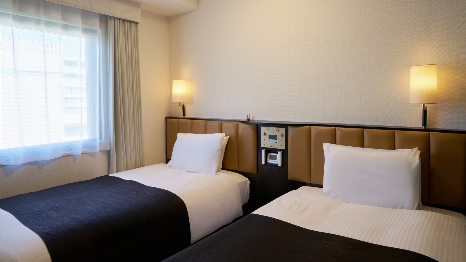 広さ15平米/ベッド幅110cm×2台/WiーFi接続無料/ルームシアター無料放映