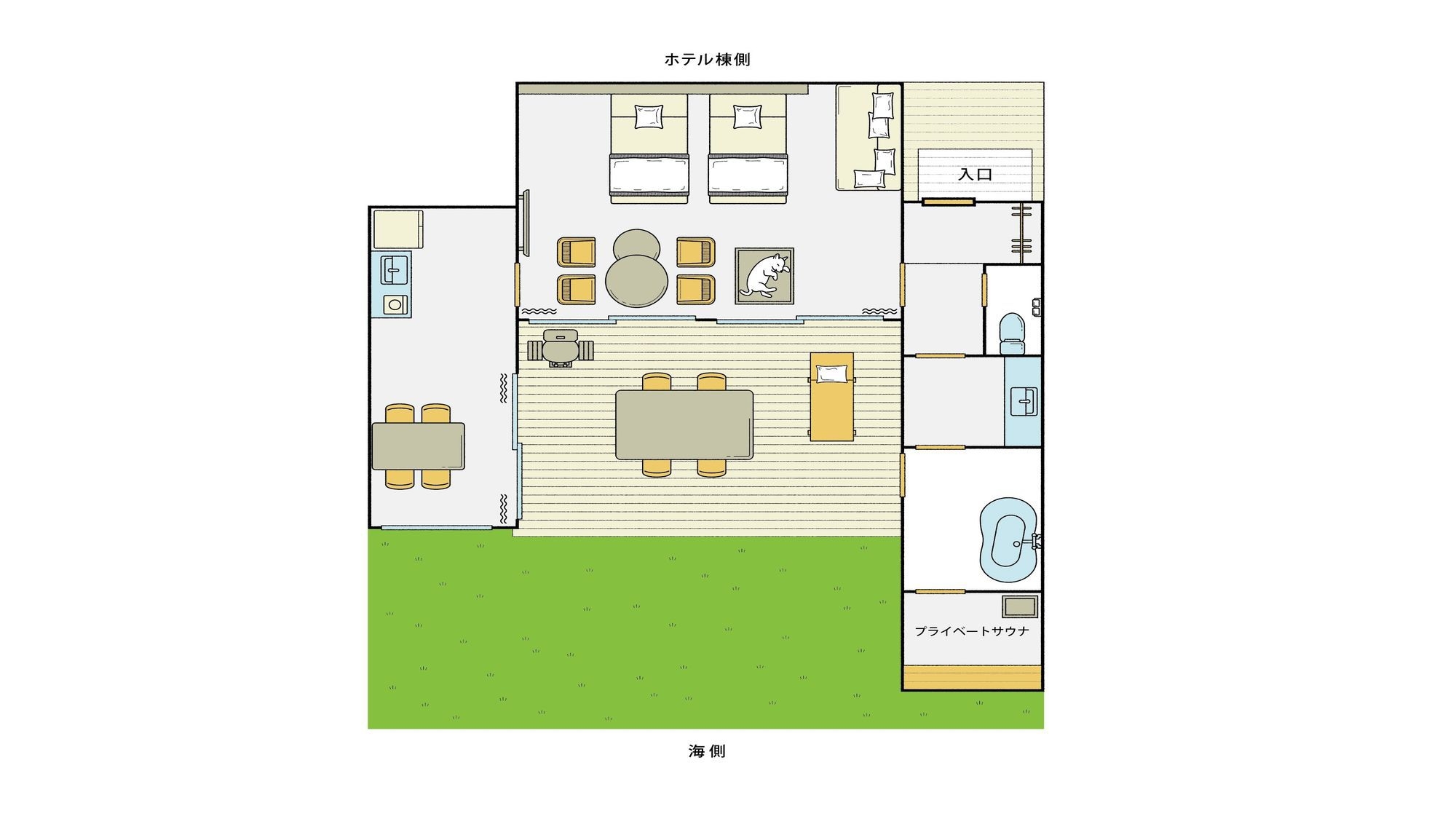 ※ワンちゃんルームは1階ヴィラ棟となります。ワンちゃんは専用出入口からご利用いただきます。
