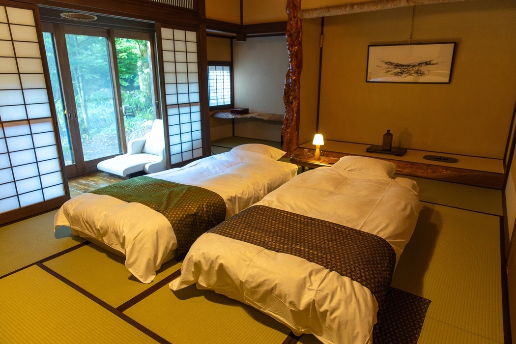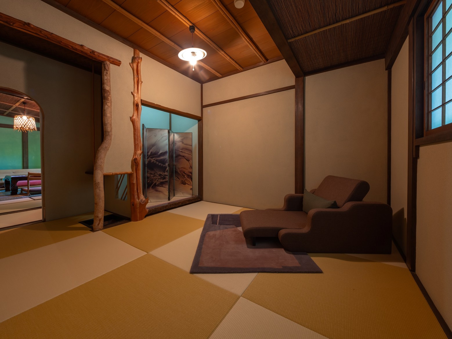 <客室12帖+談話室7.5帖+茶室4.5帖+囲炉裏付談話室+総檜風呂>旧宮村の古民家を移築したお部屋。歴史の深みと趣をお楽しみいただけるように仕立ててあります。